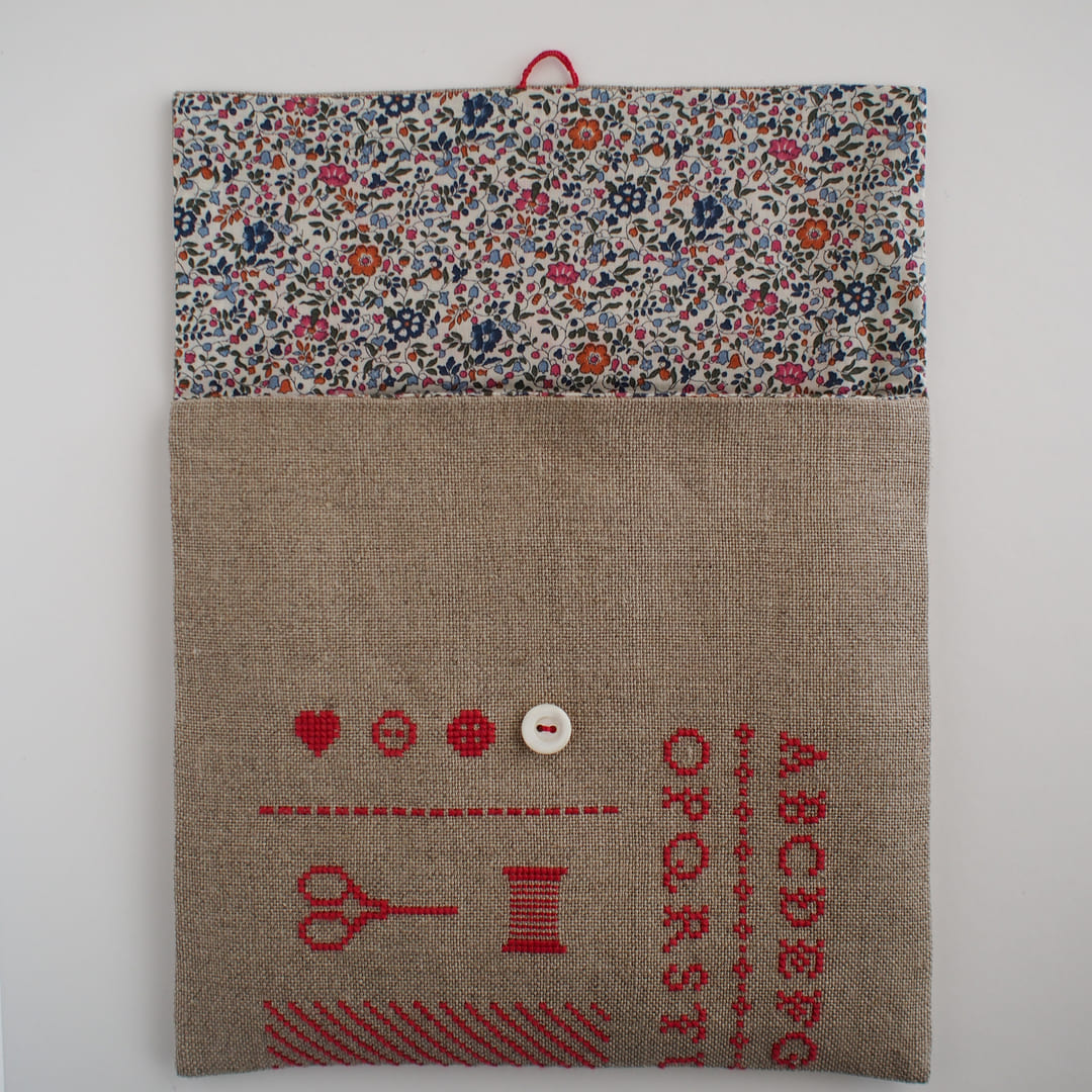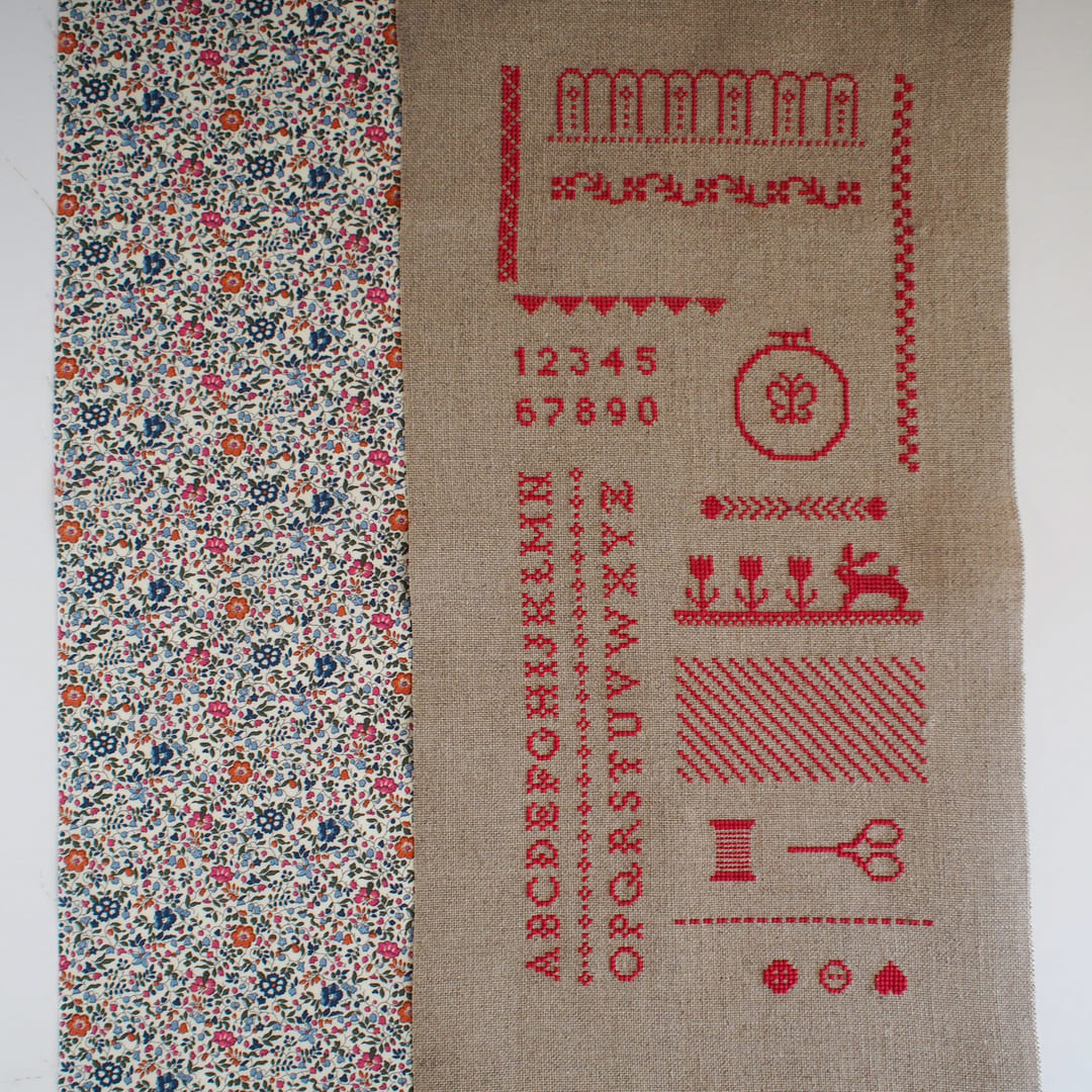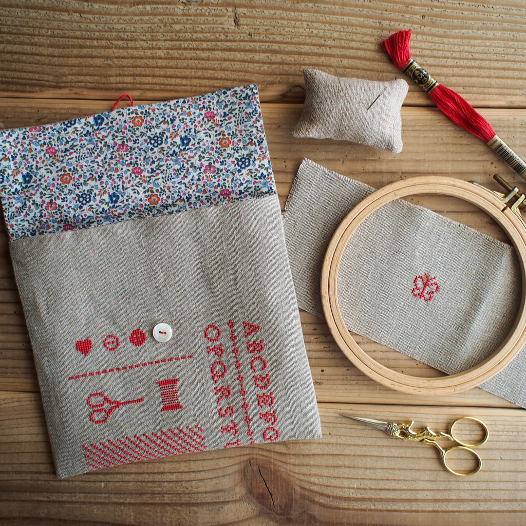 カウンティングリネンにクロスステッチで刺しゅうし、ポーチに仕立てるキットです。