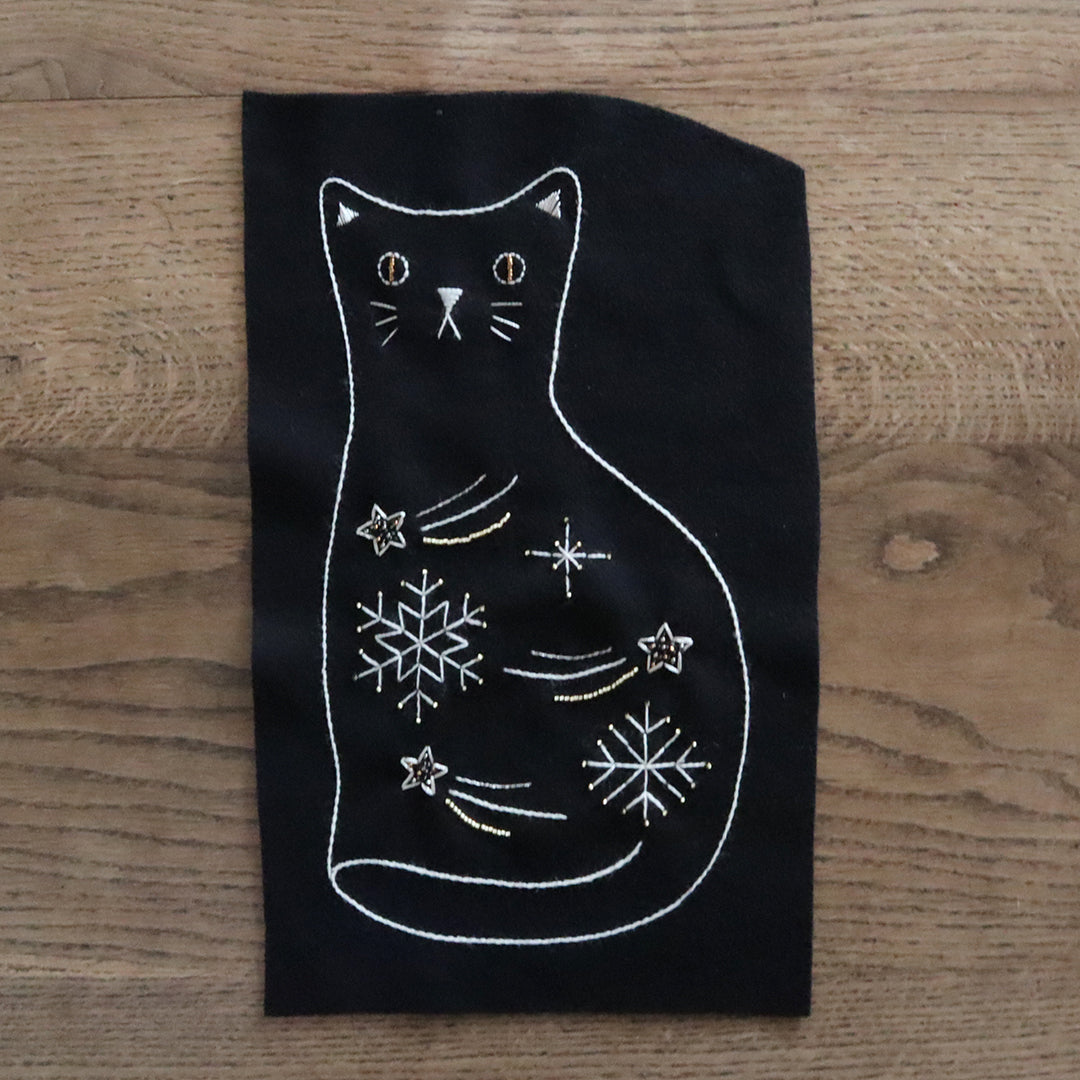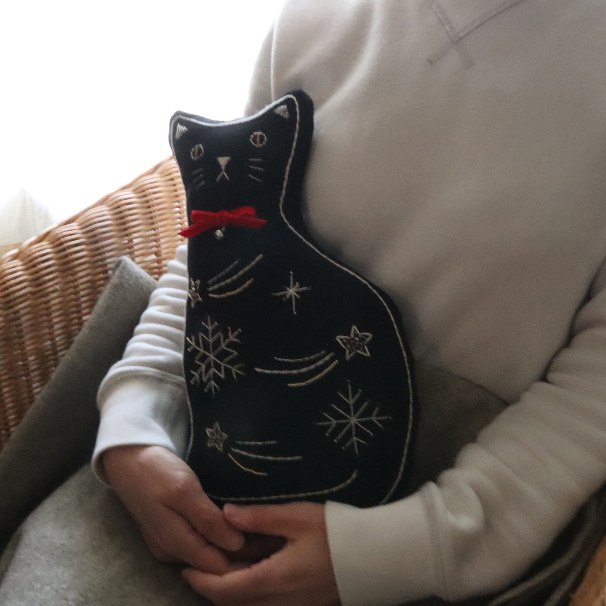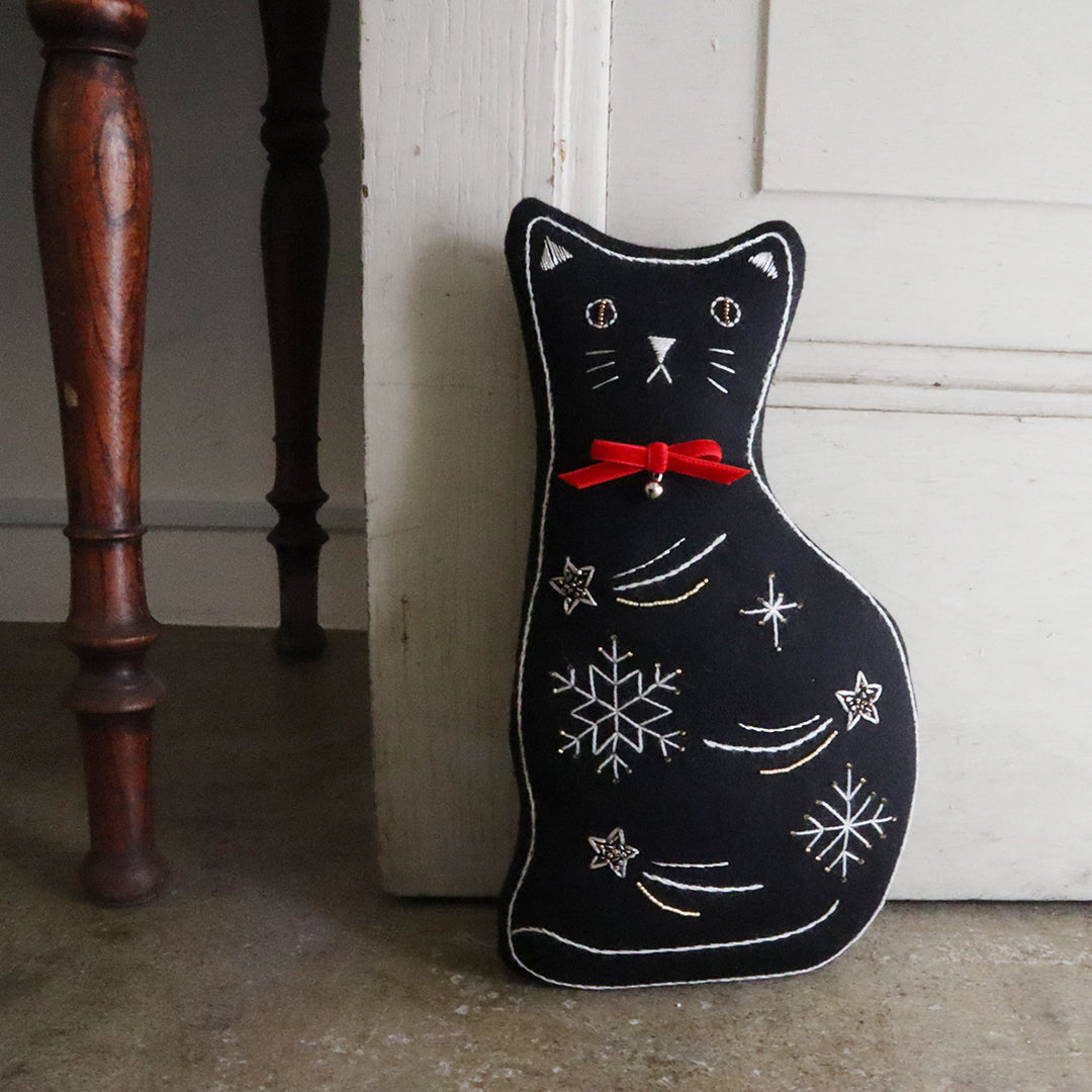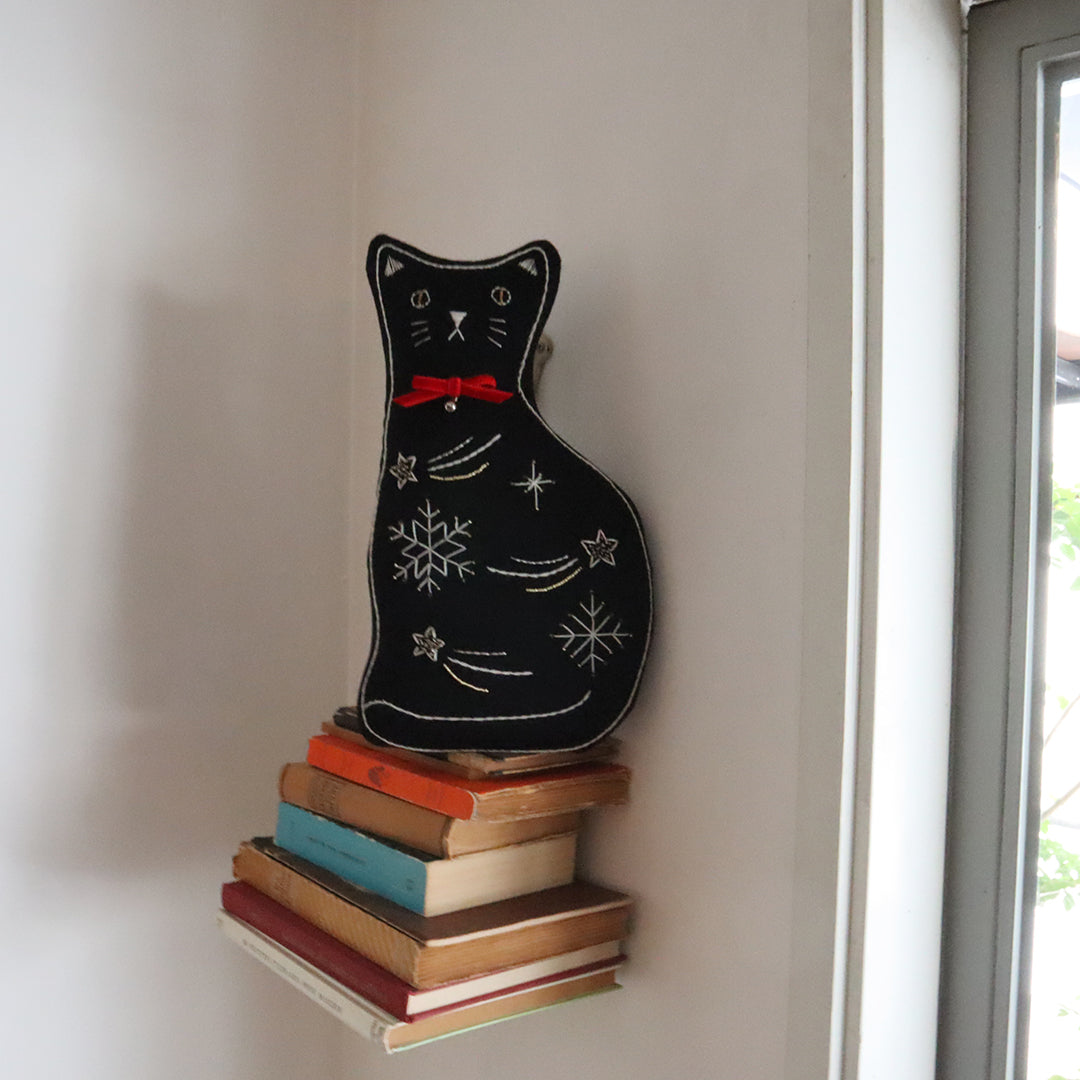 くろねこのシルエットに、白い糸で雪の結晶や星を刺繍した、ちょこんと座る姿が愛らしいデザインです。首には小さな赤いリボンを結んで、ちょっとおめかし。