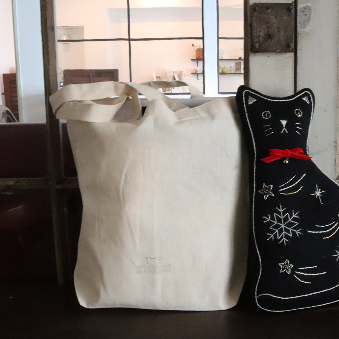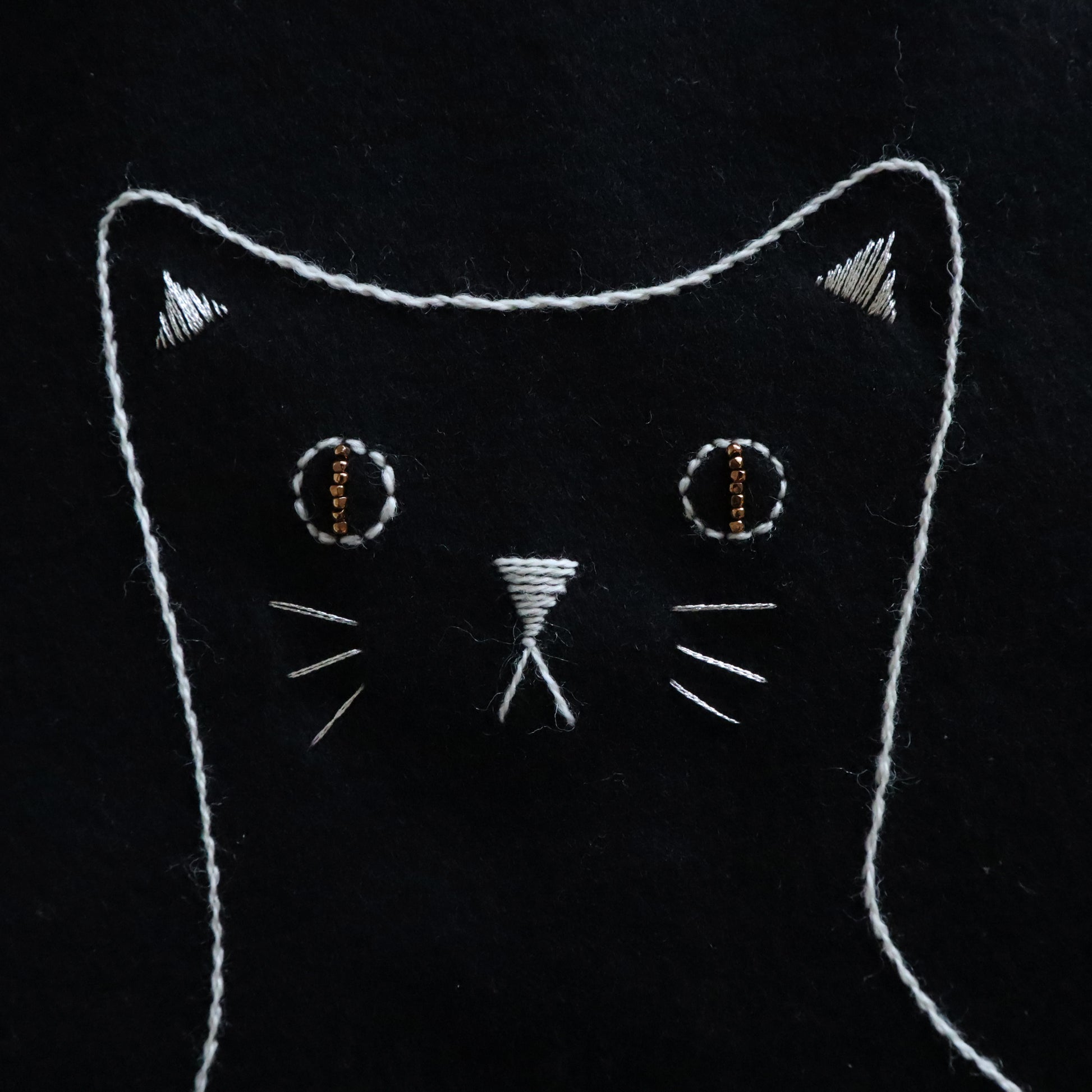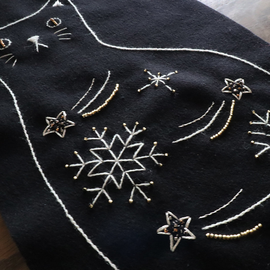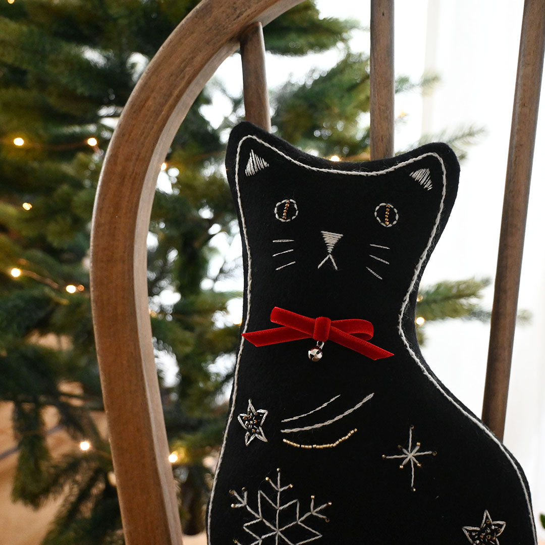 くろねこのシルエットに、白い糸で雪の結晶や星を刺繍した、ちょこんと座る姿が愛らしいデザインです。首には小さな赤いリボンを結んで、ちょっとおめかし。