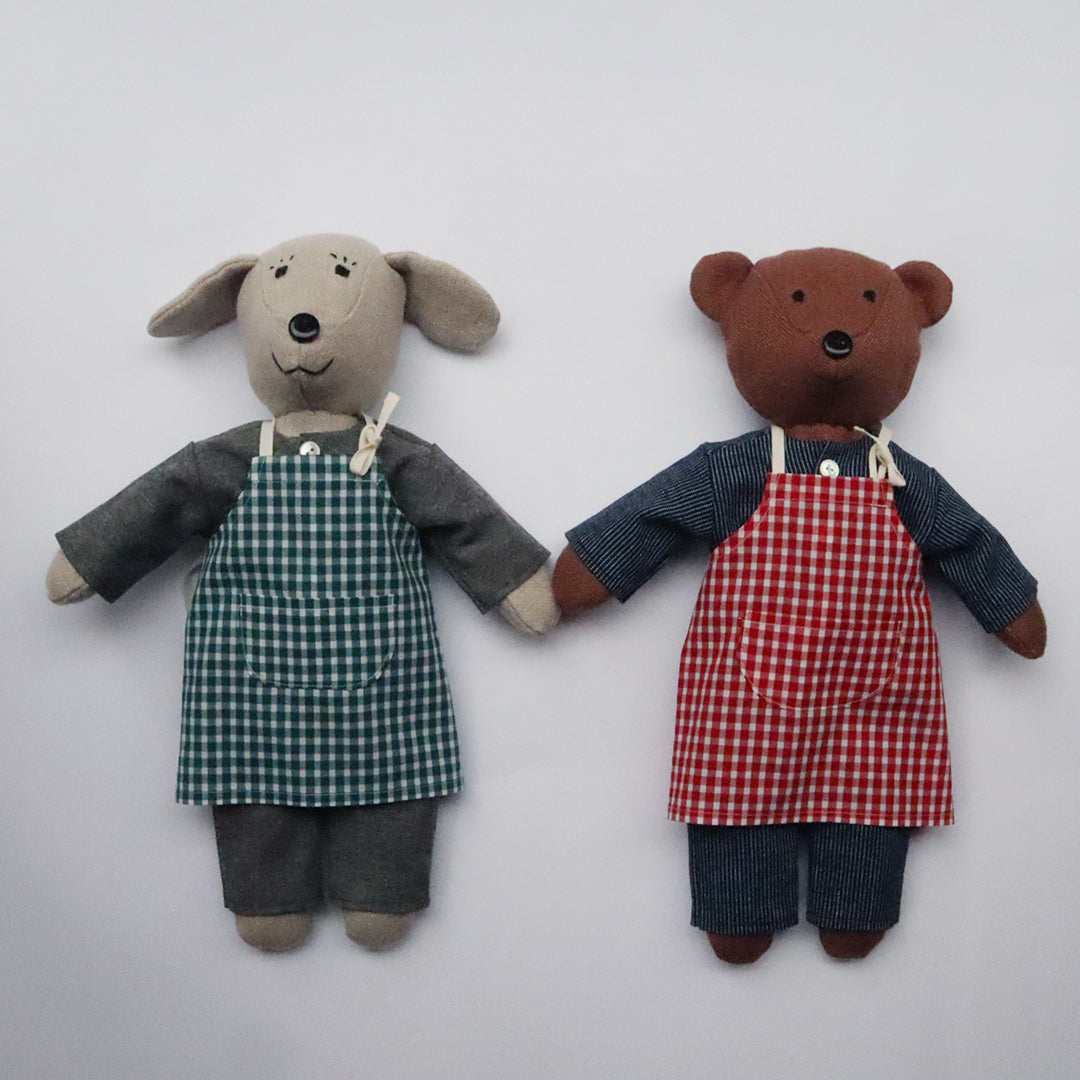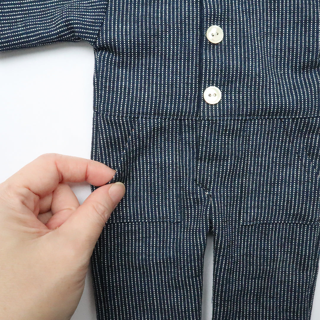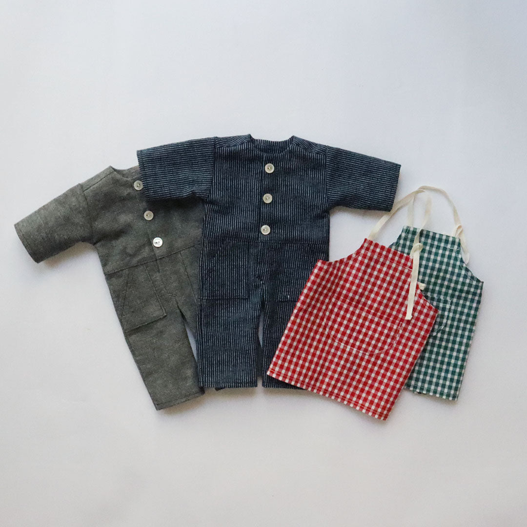 フラクシィのお店「Flaxy's」のユニフォーム、オールインワンとエプロンの着せ替えセットです。オールインワンとリバティファブリックのエプロンを合わせたおしゃれなコーディネート。小さいけれどデザインのこだわりがたくさん散りばめられています。フラクシィとクゥクゥ、両方に着せることができます。