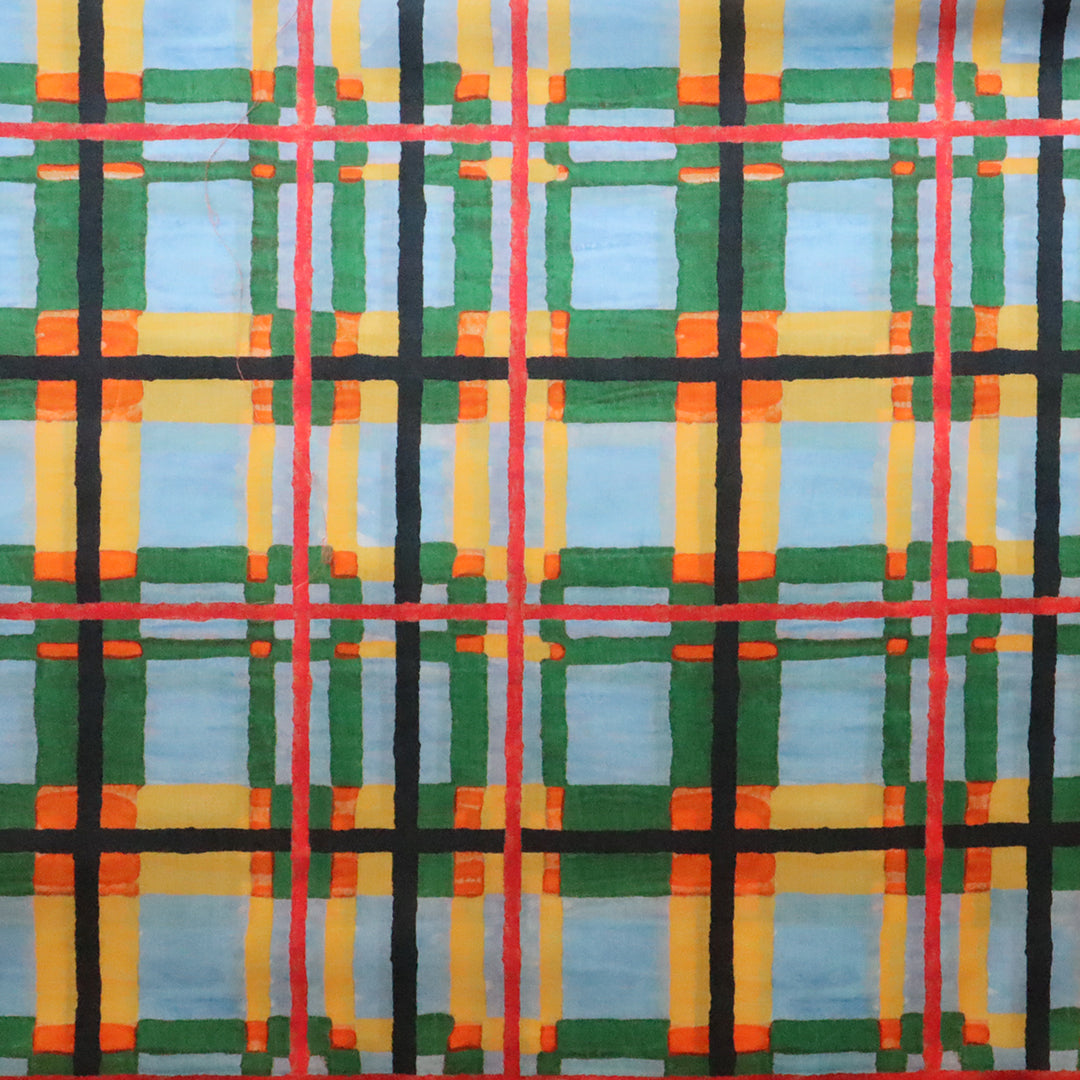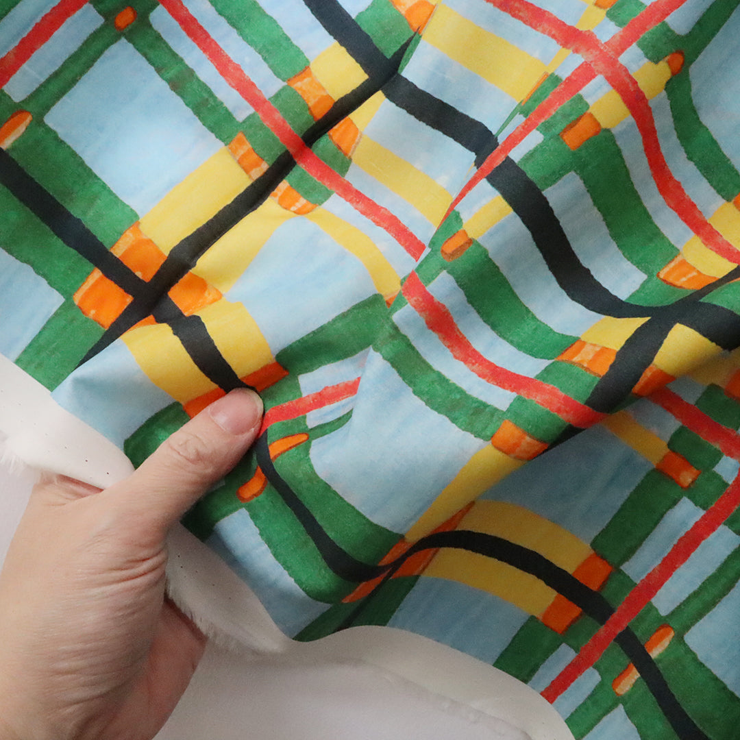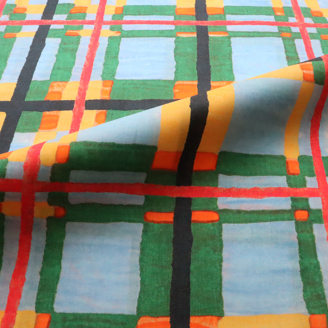 1970年のリバティプリントの試し刷り紙をベースにした「フローリー」は、絵画的でモダンなチェック柄が今コレクションの大胆な花柄と見事に調和します。オリジナルデザインのテクスチャーを丁寧に再現しながら、強い格子模様を柔らかく調整することで、より繊細で優雅な印象を与えています。