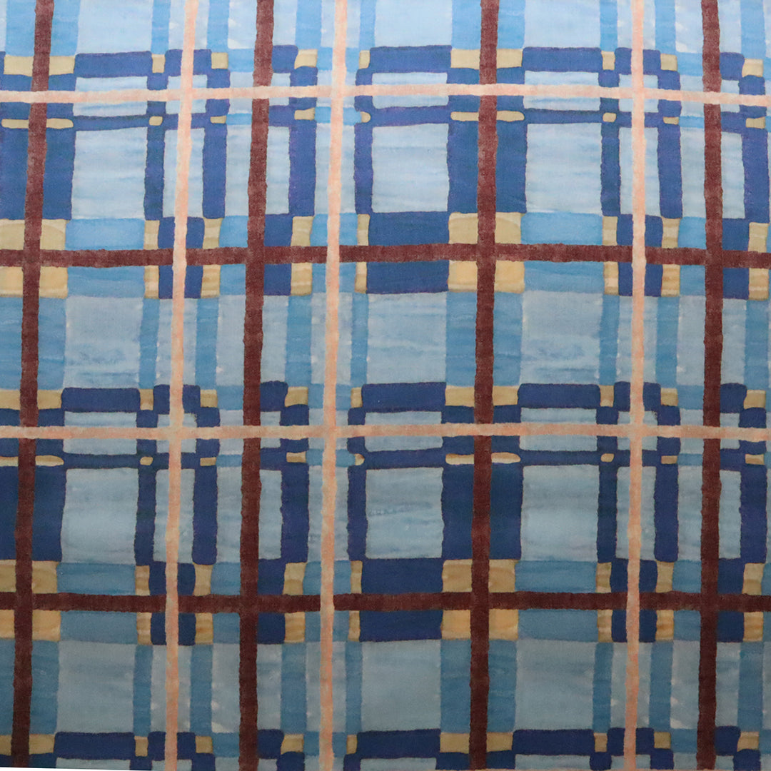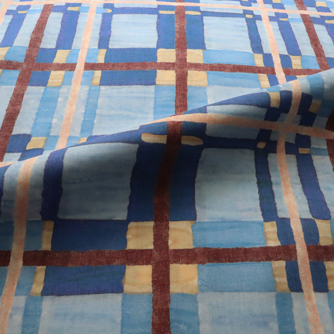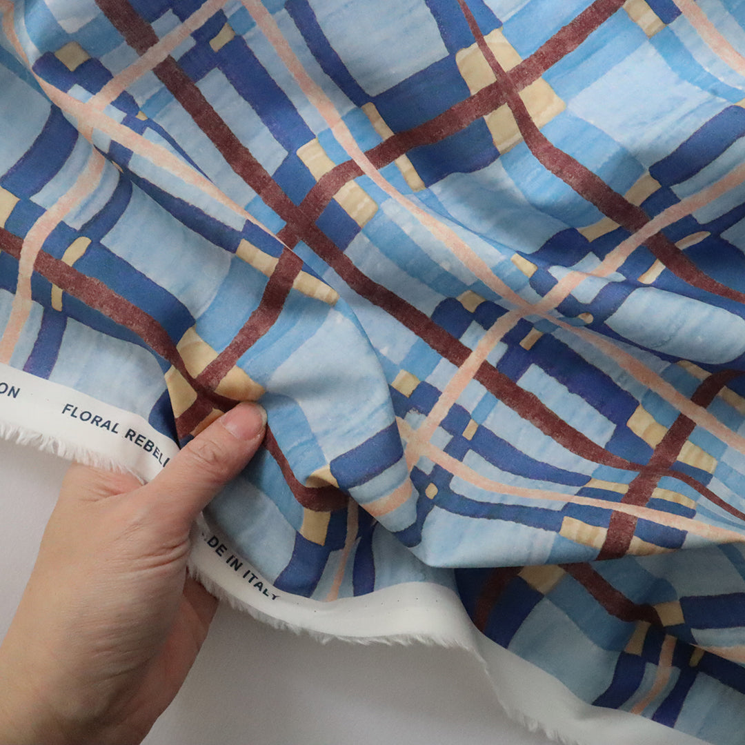 1970年のリバティプリントの試し刷り紙をベースにした「フローリー」は、絵画的でモダンなチェック柄が今コレクションの大胆な花柄と見事に調和します。オリジナルデザインのテクスチャーを丁寧に再現しながら、強い格子模様を柔らかく調整することで、より繊細で優雅な印象を与えています。