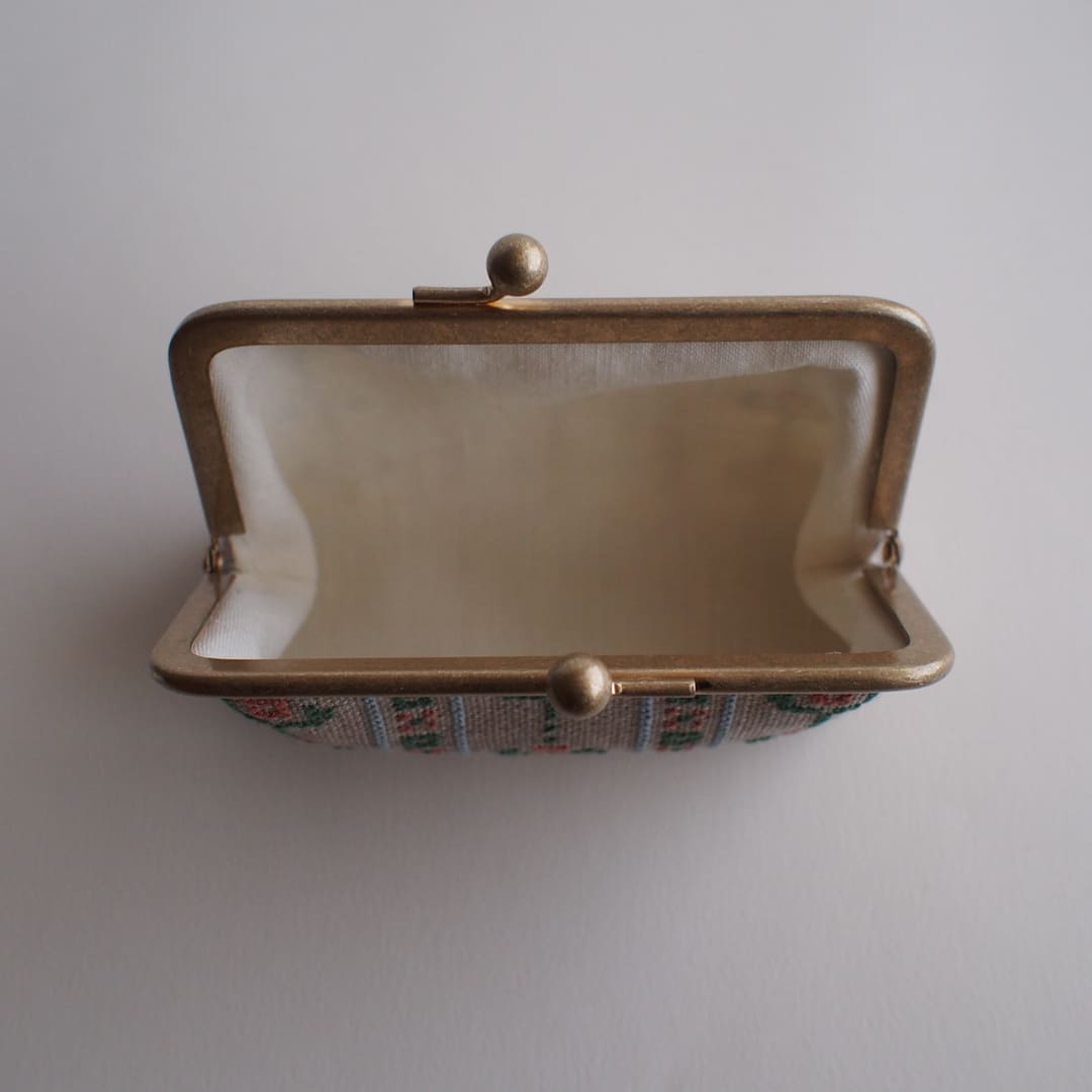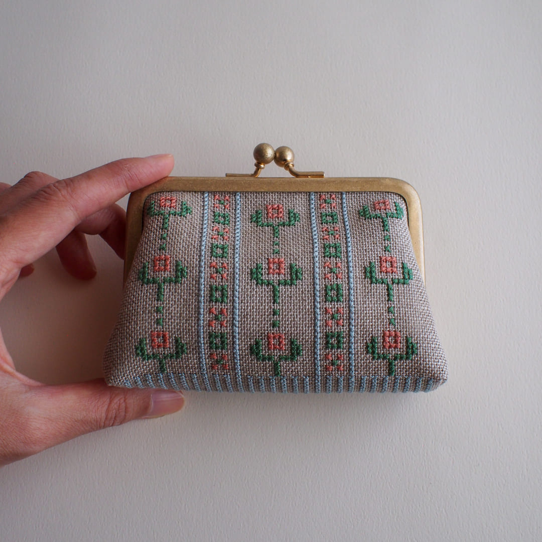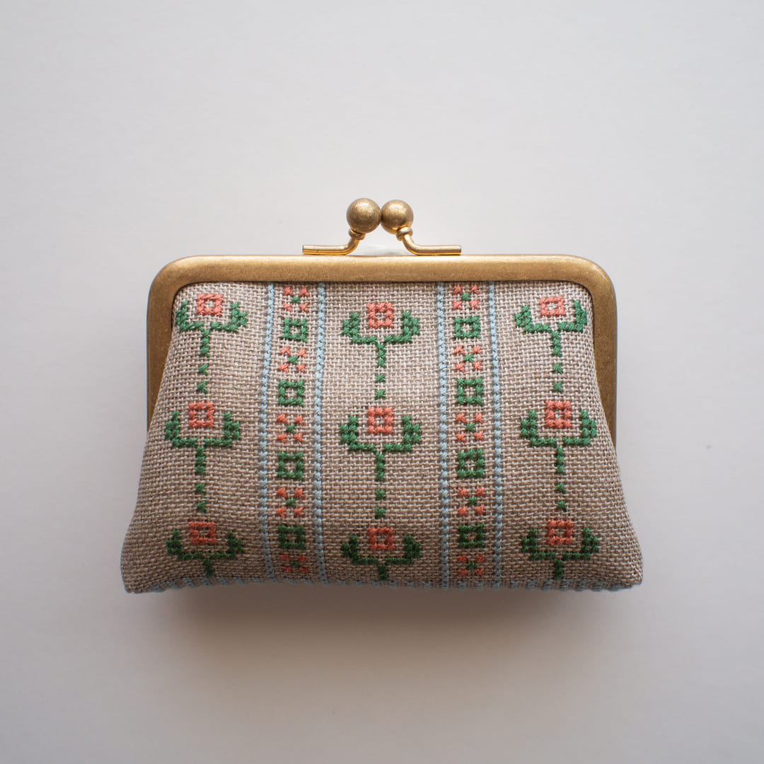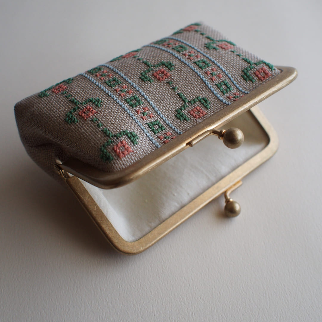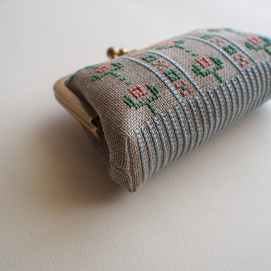 リネンにクロスステッチを施して仕上げる、がま口ポーチのキットです。