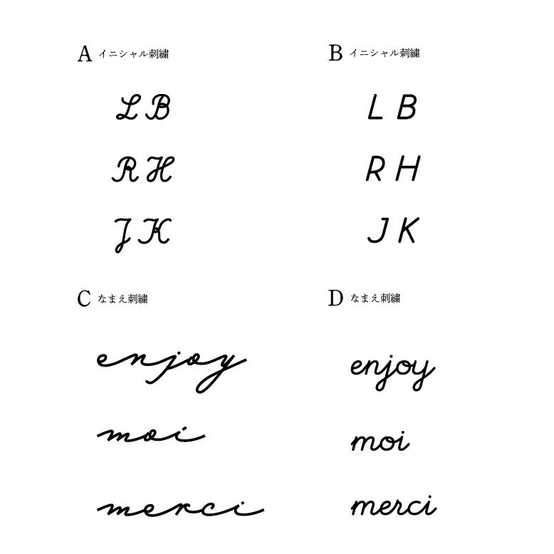 ※文字数は10文字程度です。(イニシャル刺繍は2文字まで)フォントのサイズはアイテムと文字数によってこちらで調整いたします。