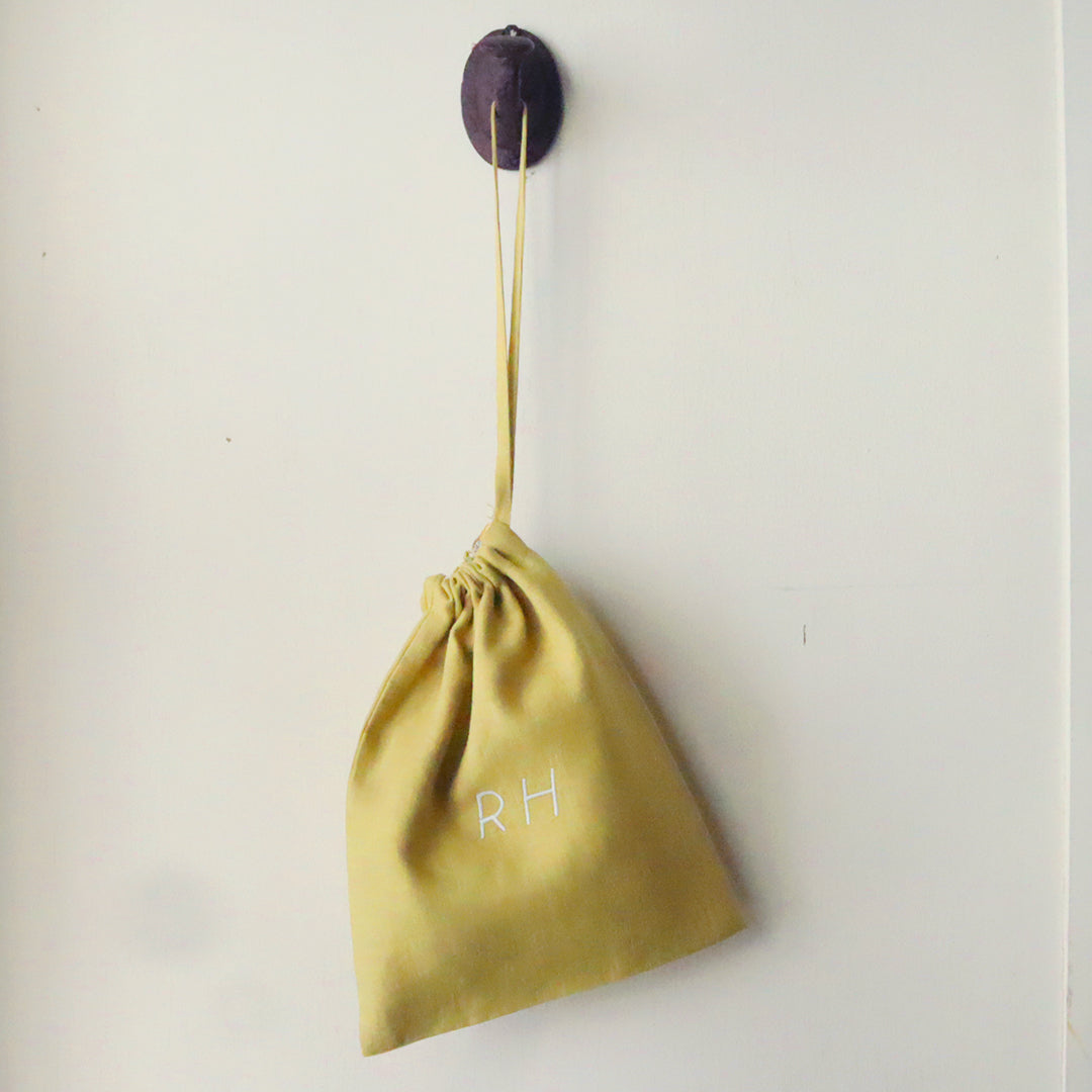 ▲巾着袋(小)イエロー たて22cm×よこ18cm イニシャル刺繍A