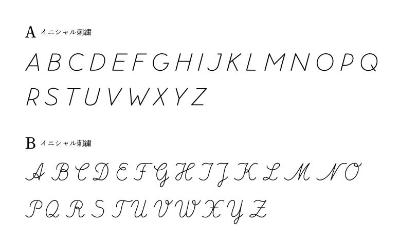 シンプルな「イニシャル刺繍」と文字が連なった「なまえ刺繍」。お好みの刺繍の種類を選び、それぞれにおすすめのフォントをお選びください。
