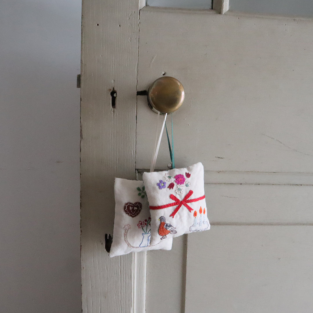 1点1点素朴であたたかい手刺繍が施されています。お部屋に吊るしたり、ドアノブに下げたりとちょっとしたインテリアのアクセントになります。