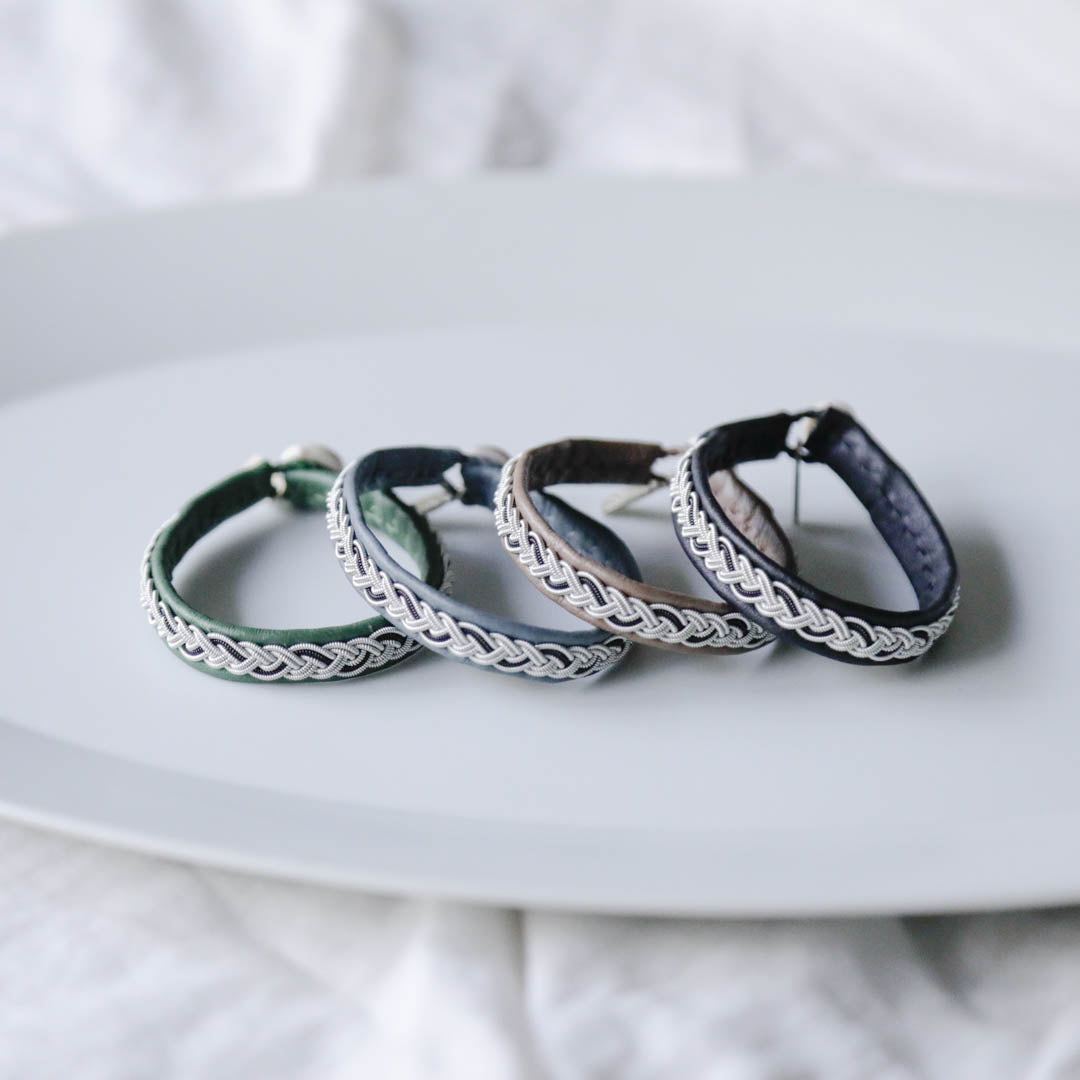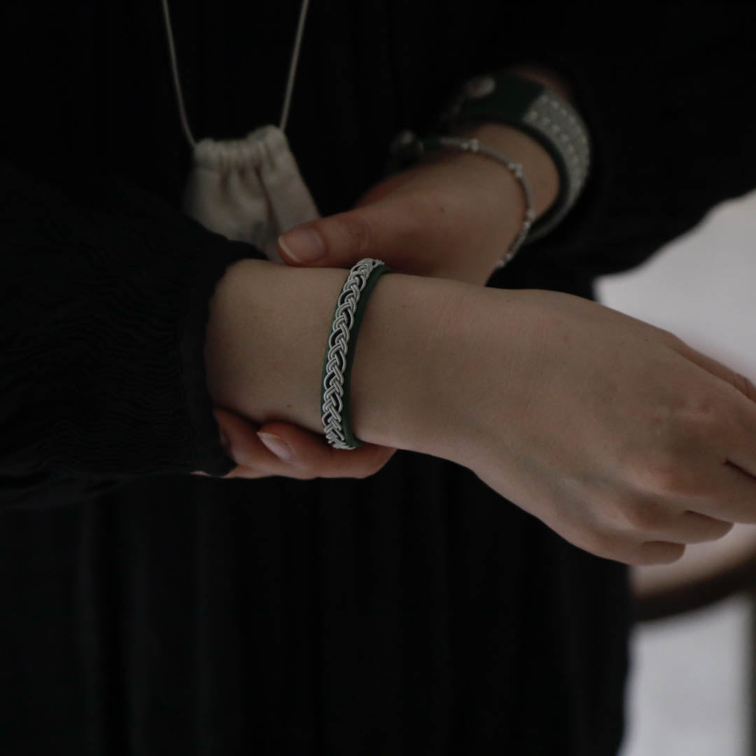 ピューターワイヤーを編み革に刺繍するブレスレットは、トナカイを食べて暮らすサーミ族ならではのアクセサリー、お守りのような存在です。
