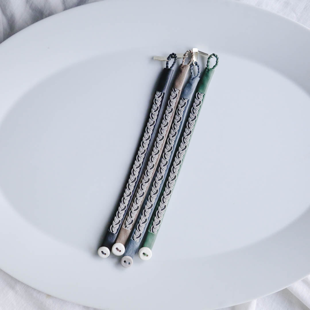 革の色はブラック、カフェラテ、グレー、グリーンの4色からお選びください。身に着けていくうちに革はやわらかくなじみ、風合いが増していきます。