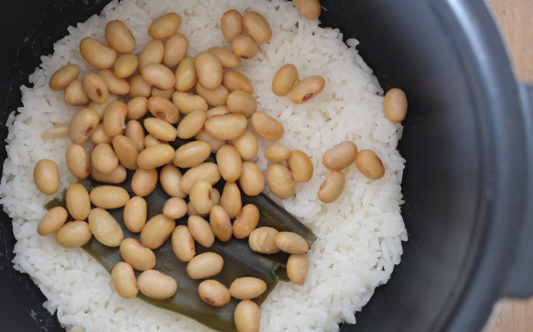 お米1合に塩小さじ1/2を加え、昆布10cmをのせたら、いつもと同じ水分量(200cc)で炊飯。炊き上がったら、「津久井在来大豆 蒸かし豆」を1/2缶加えて、よくほぐす。10分程度蒸らしたら、できあがり。