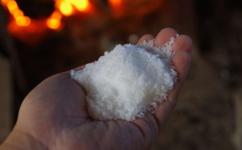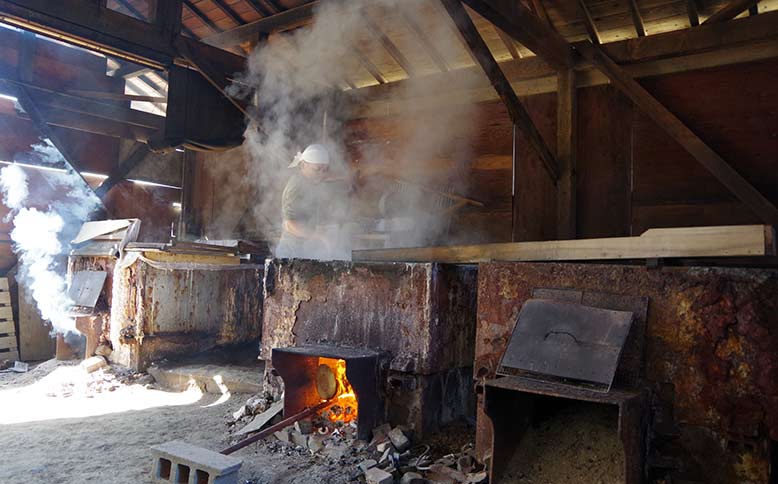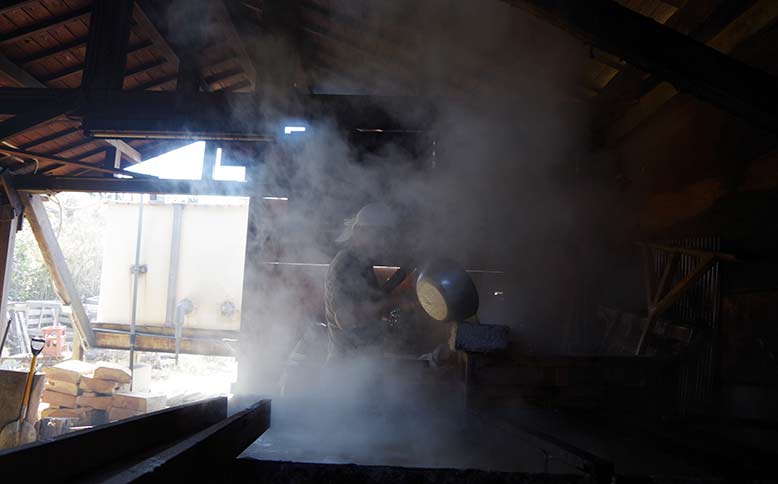 釜炊きでどれぐらいのにがりを残すかは、味の個性がでるところ。同時に技術の必要な部分です。塩分濃度が上がった海水を沸騰釜で蒸発させ、仕上げ釜でゆっくり炊いて塩の粒目を見ながら仕上げます。熱さと向き合いながら、炊き上げまでの時間はなんと40時間。