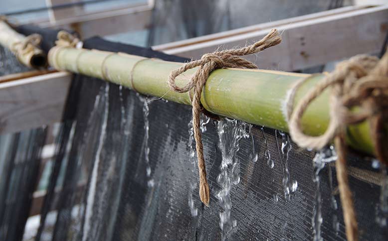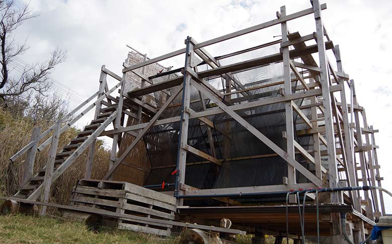 ▲天日では、海水を5mの高さからネットにかけ流し、自然の力で水分を飛ばしていきます 写真提供:脱サラファクトリー