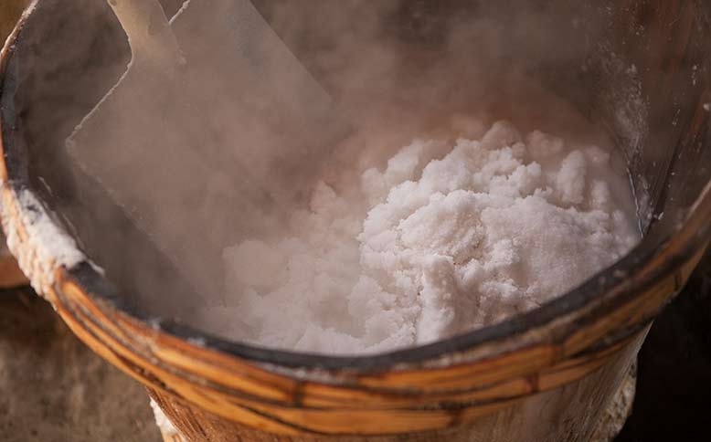 さらに濃度を上げるため天日と風の力で海水を濃縮、釜炊きを経て塩を結晶化させていきます。海水から塩になるまで、ひと口に水分を蒸発させるといってもその工程の多さには驚かされます。