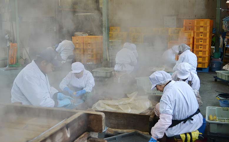 いよいよ11月の終わりから加工スタート。選別してきれいに洗った芋を蒸かし、ひとつひとつ手で皮をむいていきます。