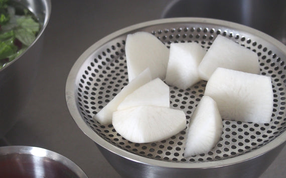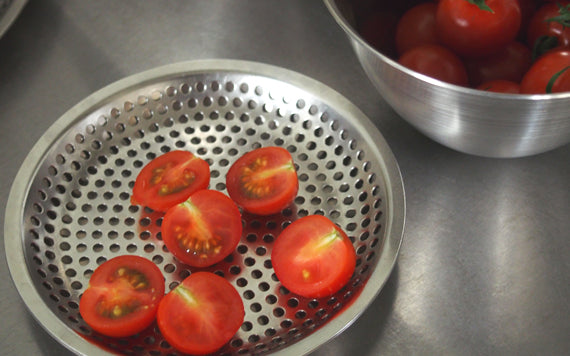 同シリーズのまかないボウルや丸バットを組み合わせることで用途の幅がどんどん広がります。まかないボウルと組み合わせて水切りに。出汁を漉すときにも重宝します。