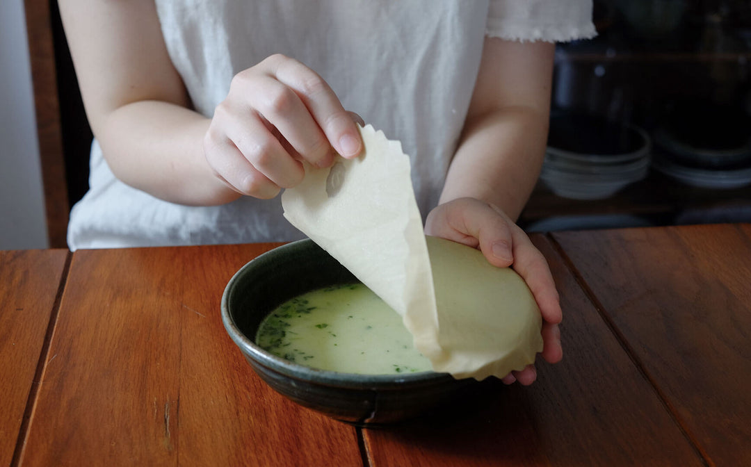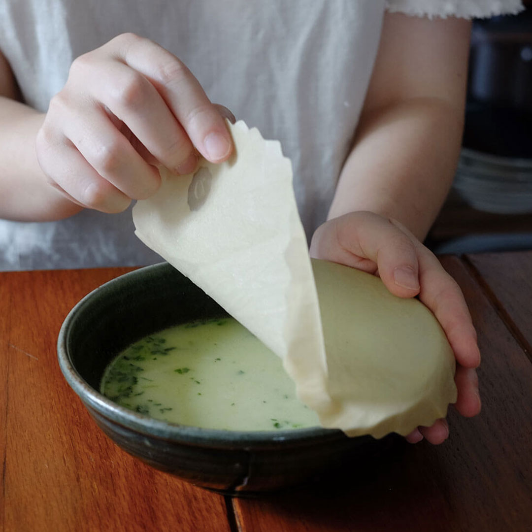 これを手で温めるとみつろうが柔らかくなり、食材や器をぴったりとラップします。みつろうとホホバオイルには天然の抗菌性があるので、食品の鮮度の持ちがよくなるそうです。▲みつろう色