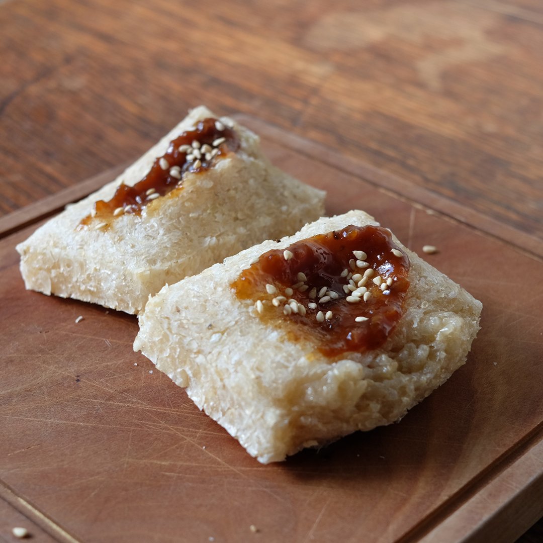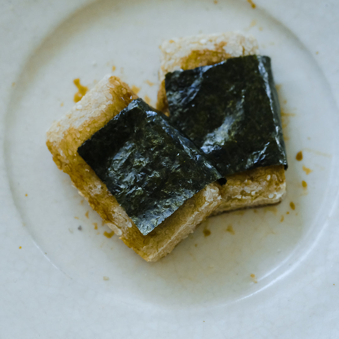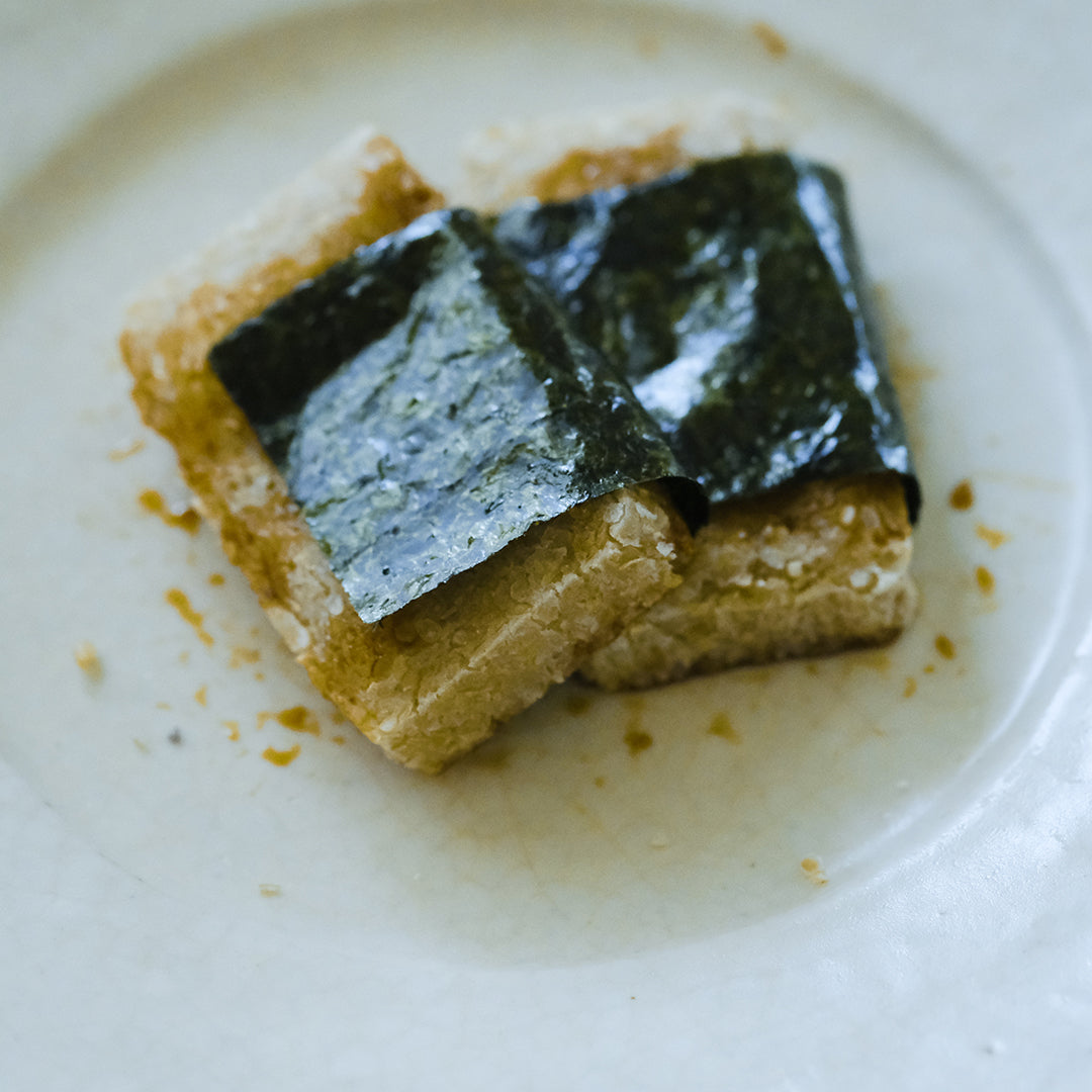 焼き餅と言えば磯辺焼き。つぶ感の残る玄米の間に砂糖醤油がじわ~っとしみ込んでいきます。熱々のうちに海苔を巻いて。