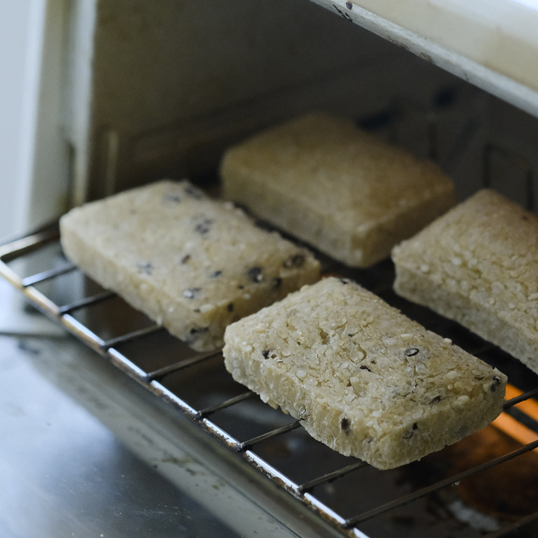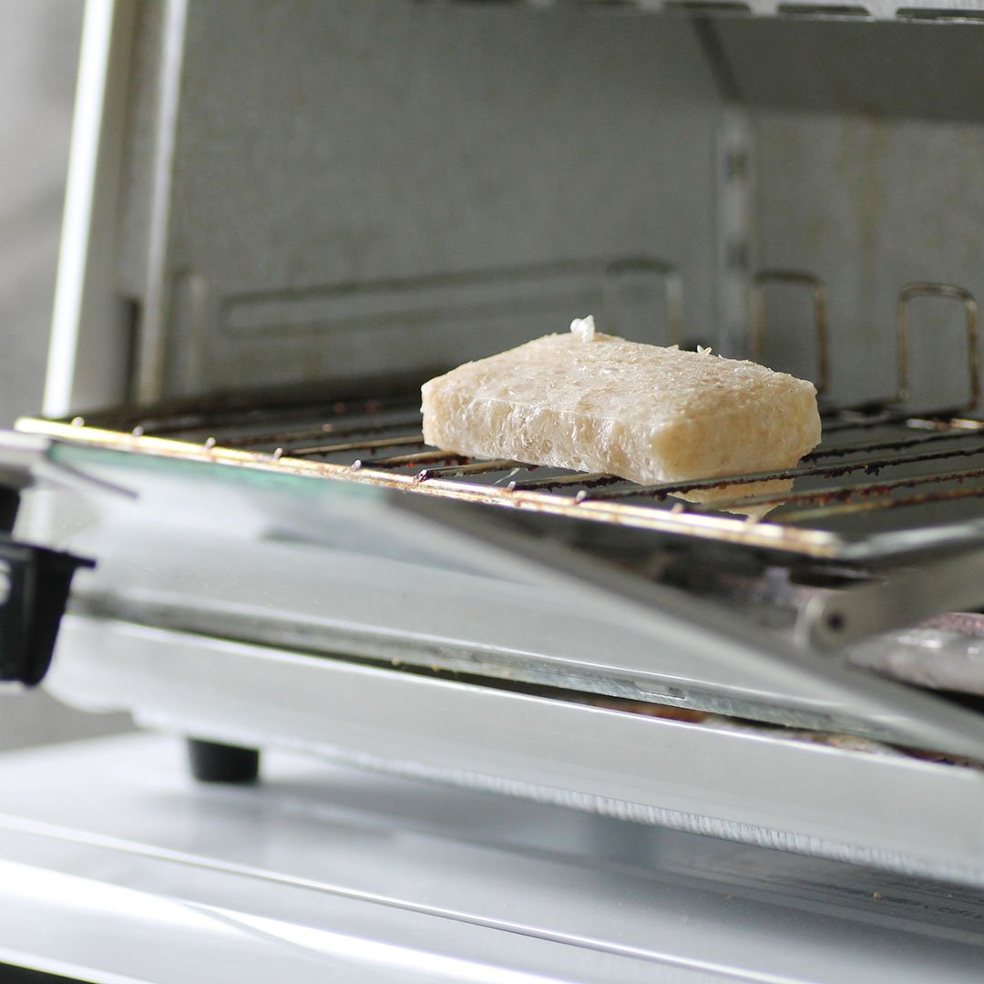 古代餅はオーブントースターで5分焼けばOK。中央がぷっくり膨らんだら、焼けた合図です。