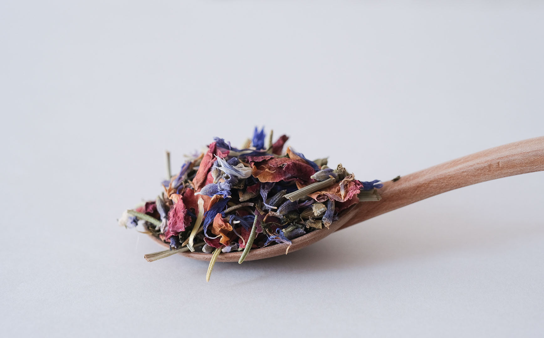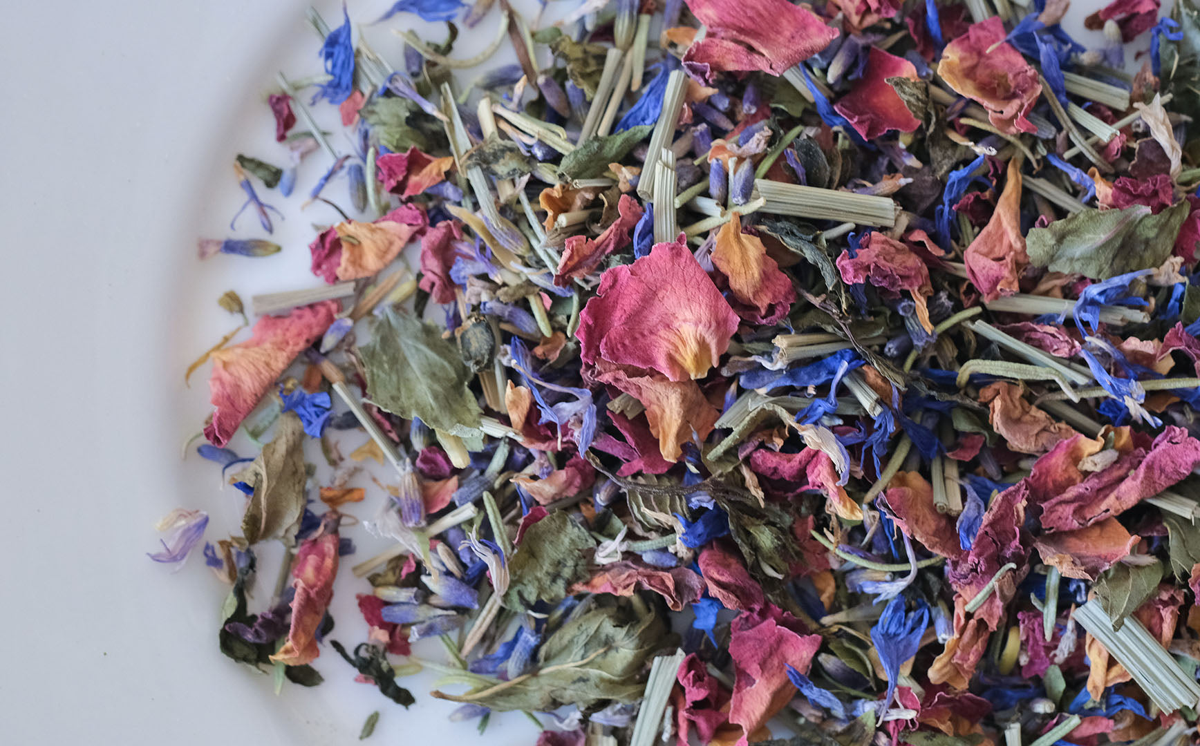 レッドローズ、ラベンダー、ローズマリー、タイム、ペパーミント、レモングラス、コーンフラワーとさまざなハーブがミックスされた「リフレッシュ」。