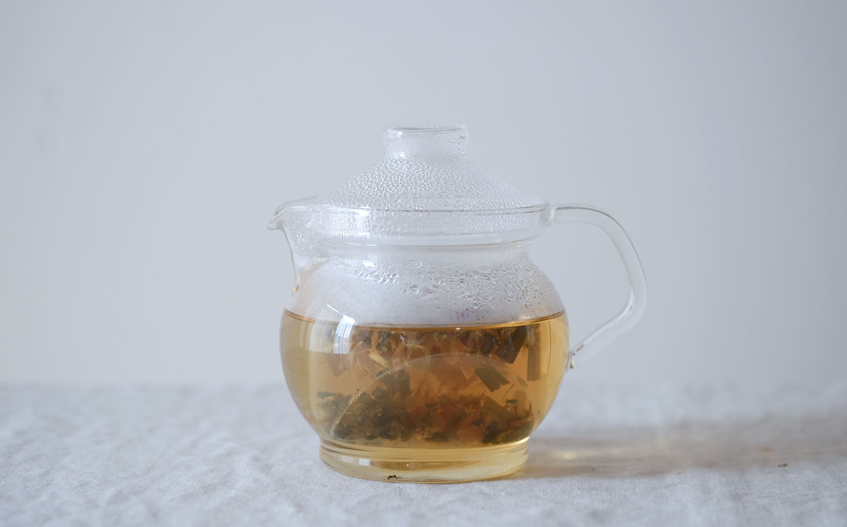 蒸気でくもったガラスポットの中で移り変わる植物の色。湯気とともに立ち上る深呼吸したくなる植物の香り。