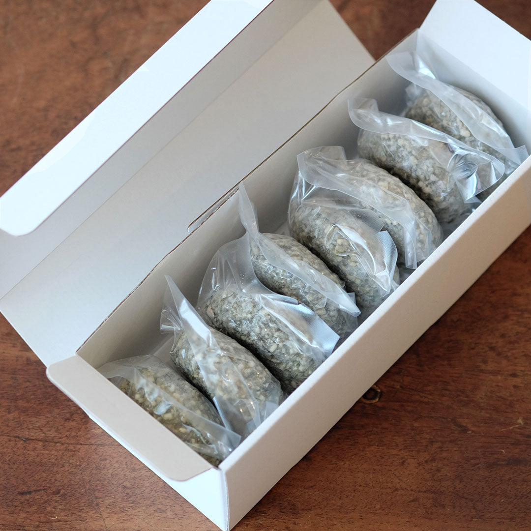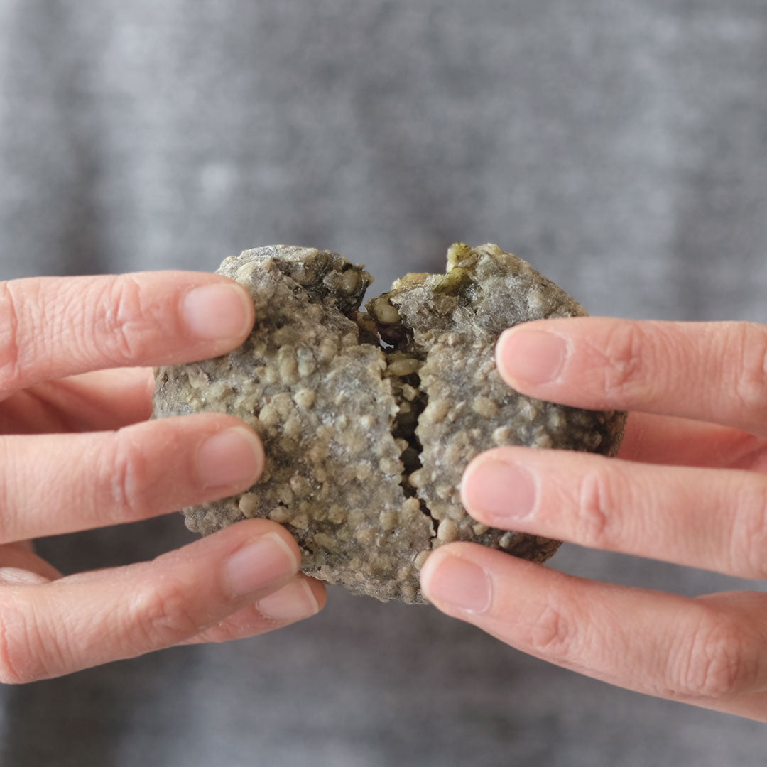古来から万能薬として用いられ、道端でよく見かけるよもぎ。新芽の時期に摘み取ったよもぎを使用した玄米もちは、春の息吹を感じさせるさわやかな香りと、いつかどこかで食べた昔懐かしい味わいです。▲お餅は自然栽培で育てた玄米を発芽させたもの。8個入り