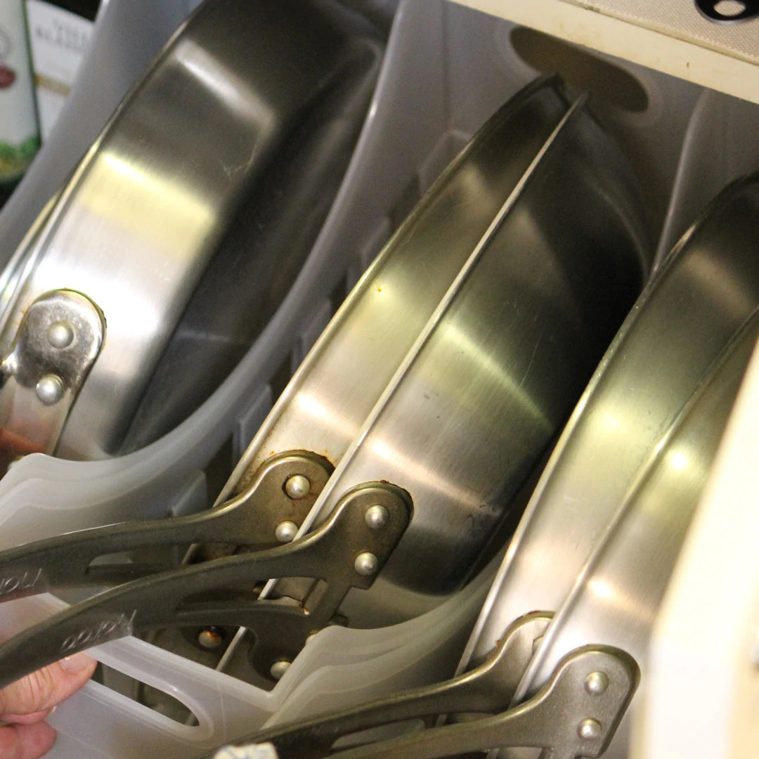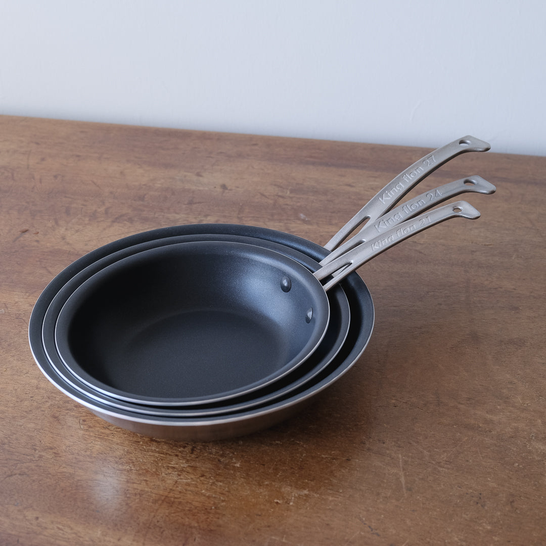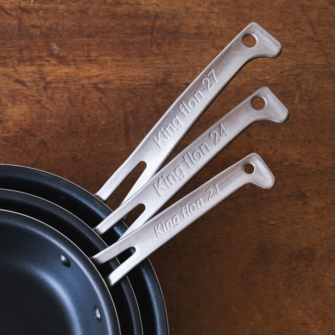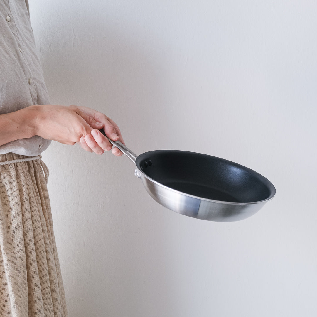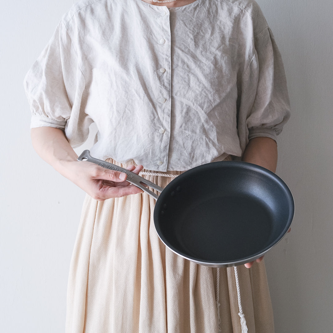また3層からなるフッ素樹脂加工のおかげで、長く快適に使うことができます。ふたつめの理由は、厨房での繰り返し調理に耐えられる頑丈さ。丈夫な道具にするために、一般的な鍋に使われる素材より硬度や純度が高いものを採用しています。