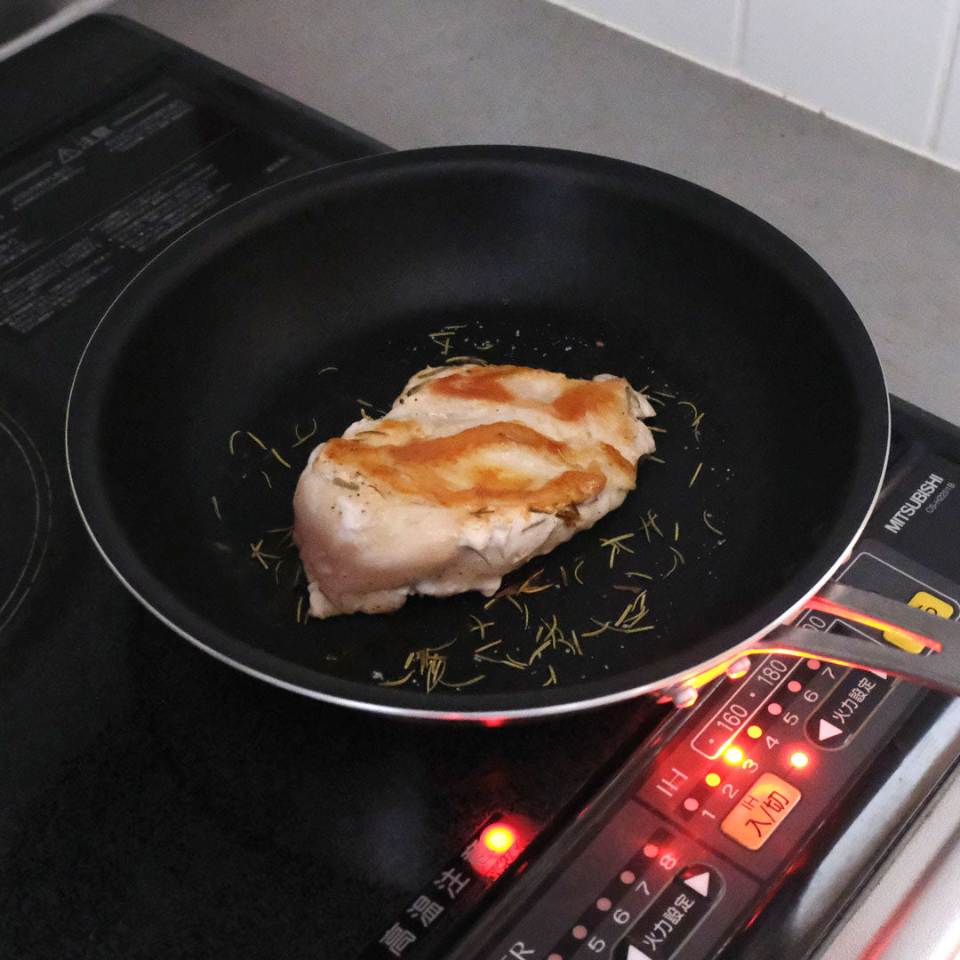 道具選びによってコンロの火力を存分に活かすことができるので、料理の時短にもなります。▲鶏むね肉のソテーは、きれいな焼き色に