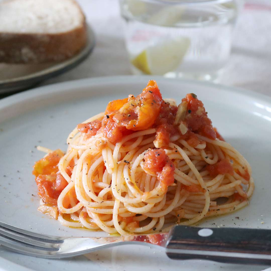 暑い季節は、フレッシュトマトやハーブ、魚介を使った冷製パスタ。寒い季節は、温かいソースやスープと合わせて楽しむことができます。