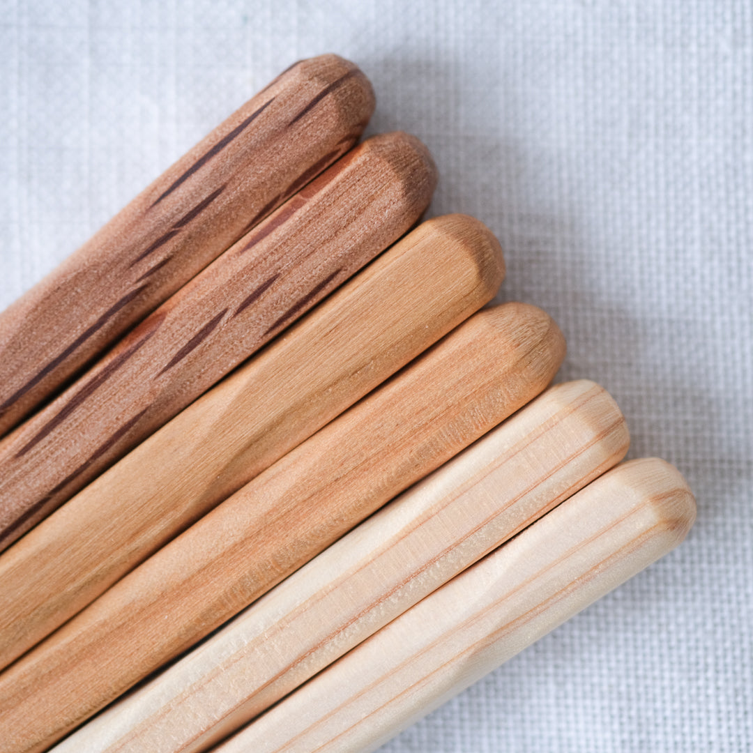 木の種類はヒノキのほかにサクラ、アカガシがあります。一本ずつ手で削ってつくられ、木目や色味はひとつひとつ異なります。手仕事のぬくもりある箸は新築祝いや結婚祝いなどちょっとした贈りものにもおすすめです。