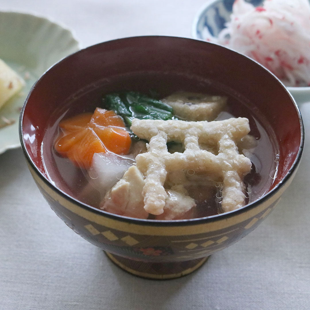 鳥居餅はオーブントースターで1分焼けばOK。お雑煮に入れたり、スープに入れたりと自由にお楽しみくださいね。