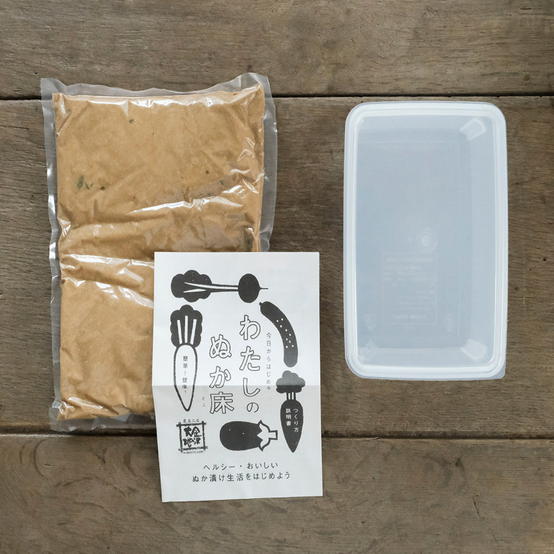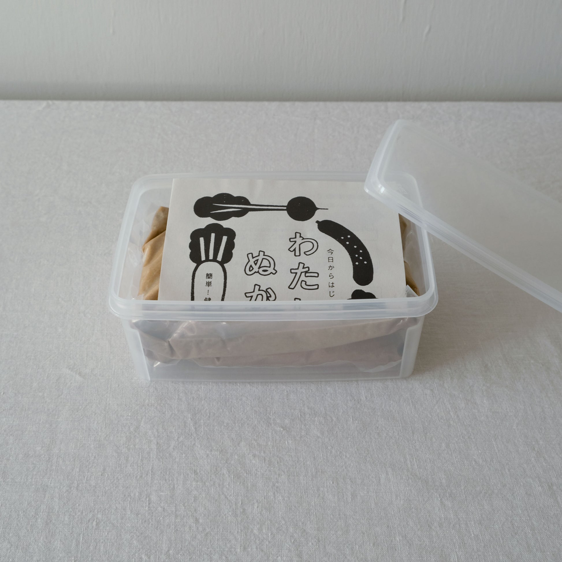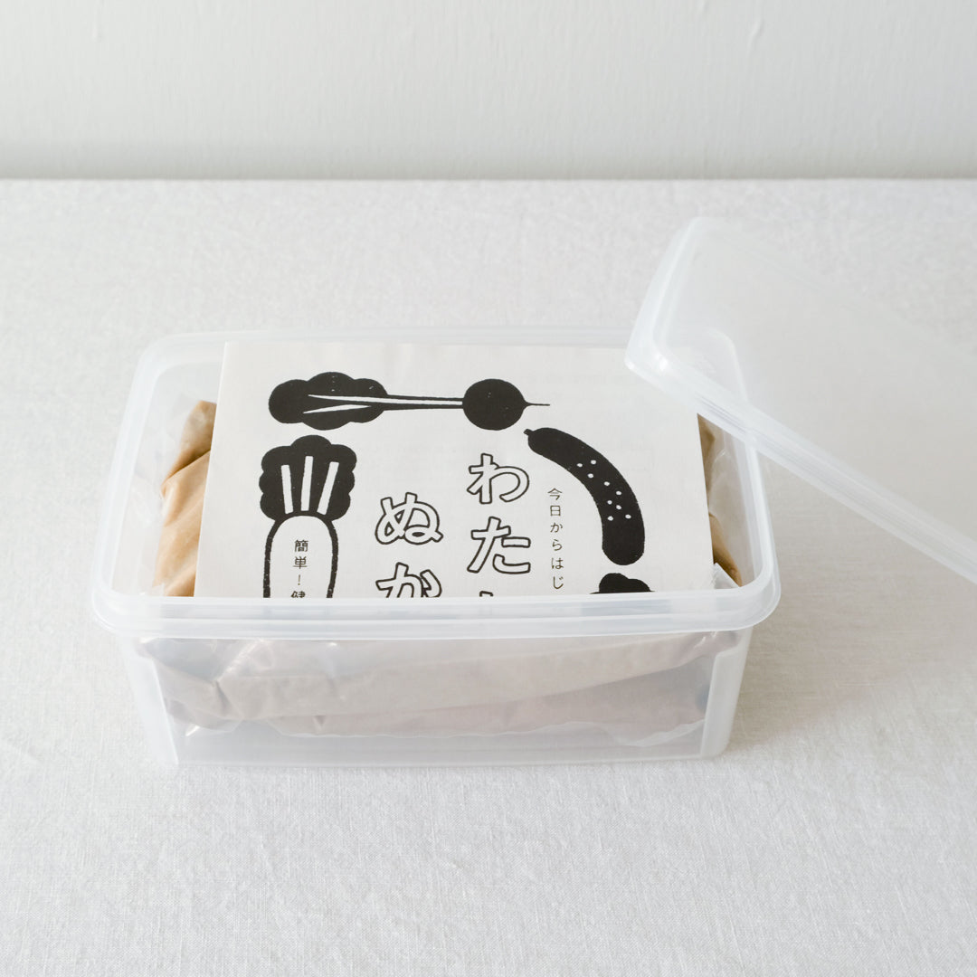 ▲専用タッパ1ケース、ぬか床1kg袋、つくり方説明書がセットになっています
