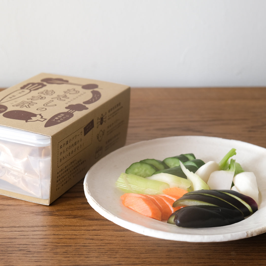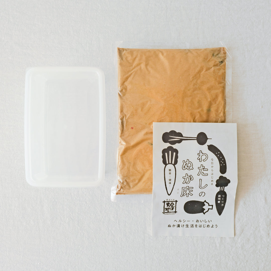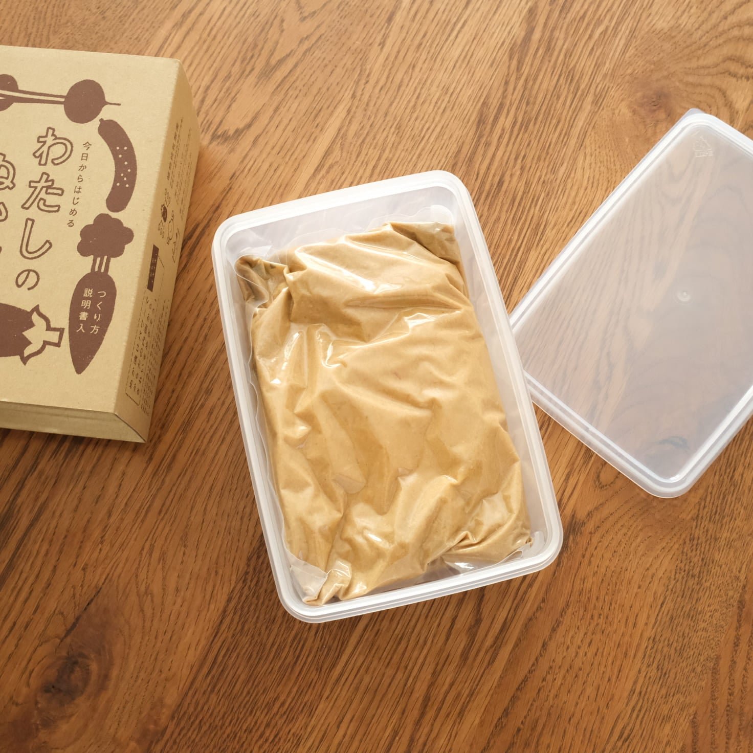 ▲専用タッパ1ケース、ぬか床1kg袋、つくり方説明書がセットになっています