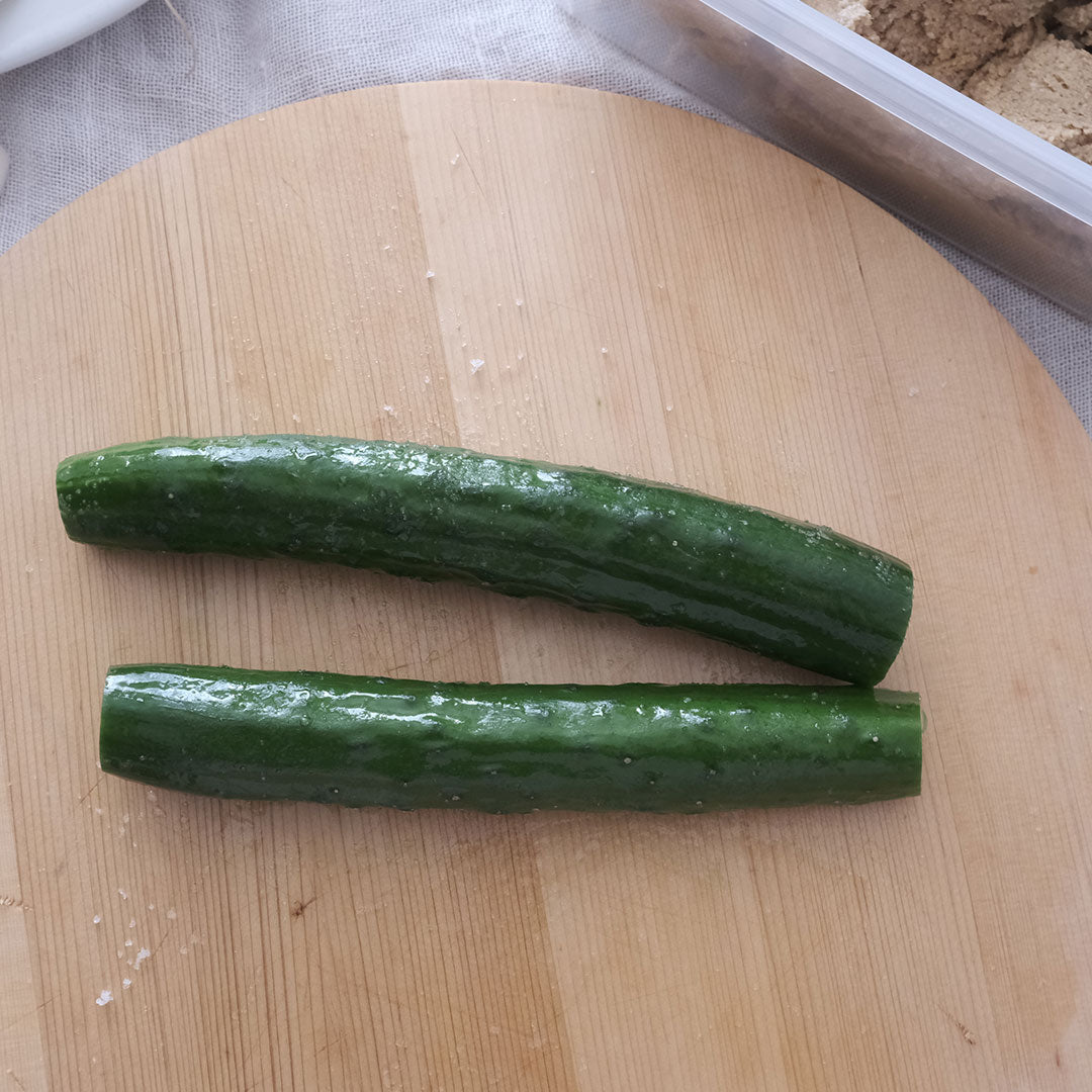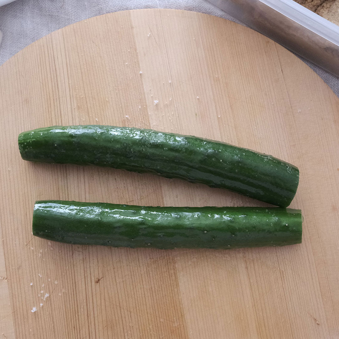 野菜を洗ったら水分をふき取ります。容器に入れやすいサイズに切って塩もみ(まな板の上で野菜を転がして塩を擦り付けるようにすると早く漬かります。塩の量は野菜1個に対して、小さじ1/2程度を目安だそう)。