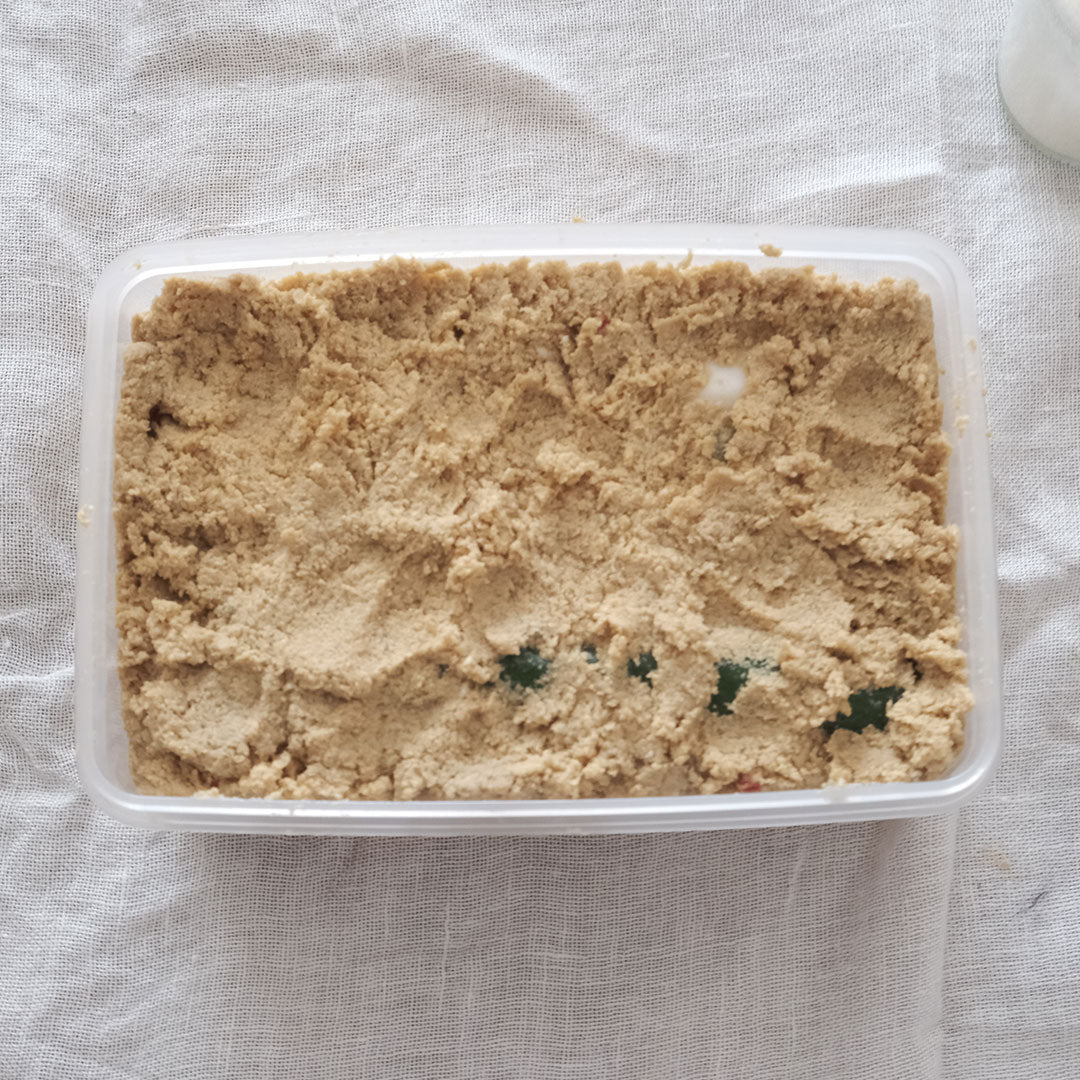 1.セットを開封。米ぬかを容器に入れてほぐす