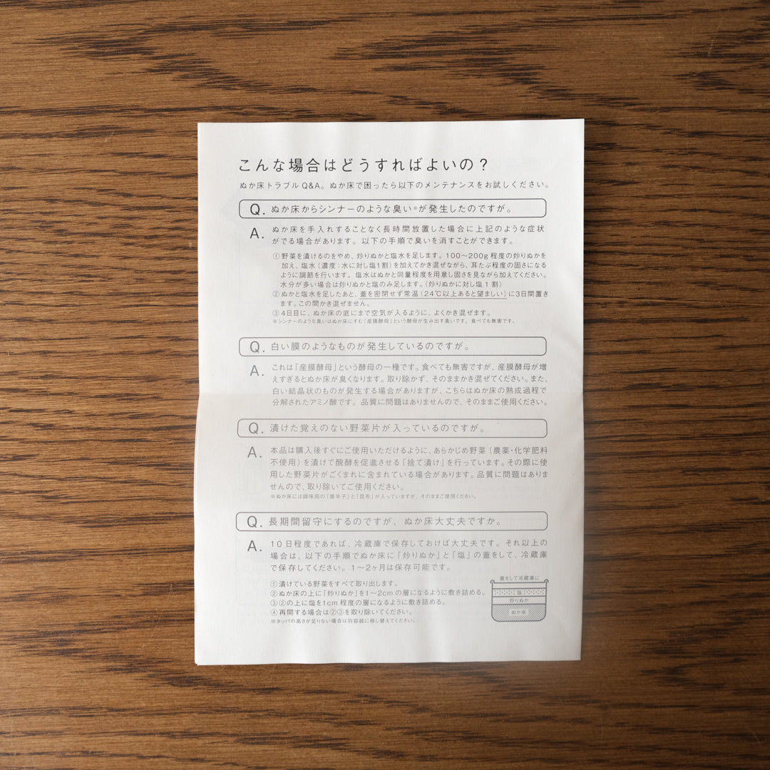 ▲説明書にはぬか漬けづくりの上でのQ&Aも。困ったらこちらや金沢大地のホームページにもぬか漬けづくりのアドバイスが詳しく載っています