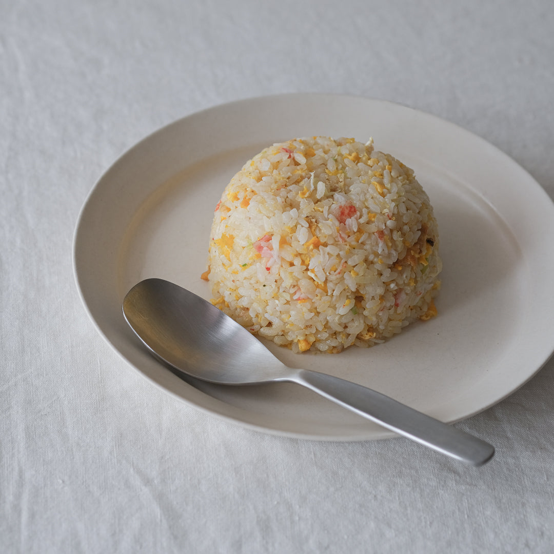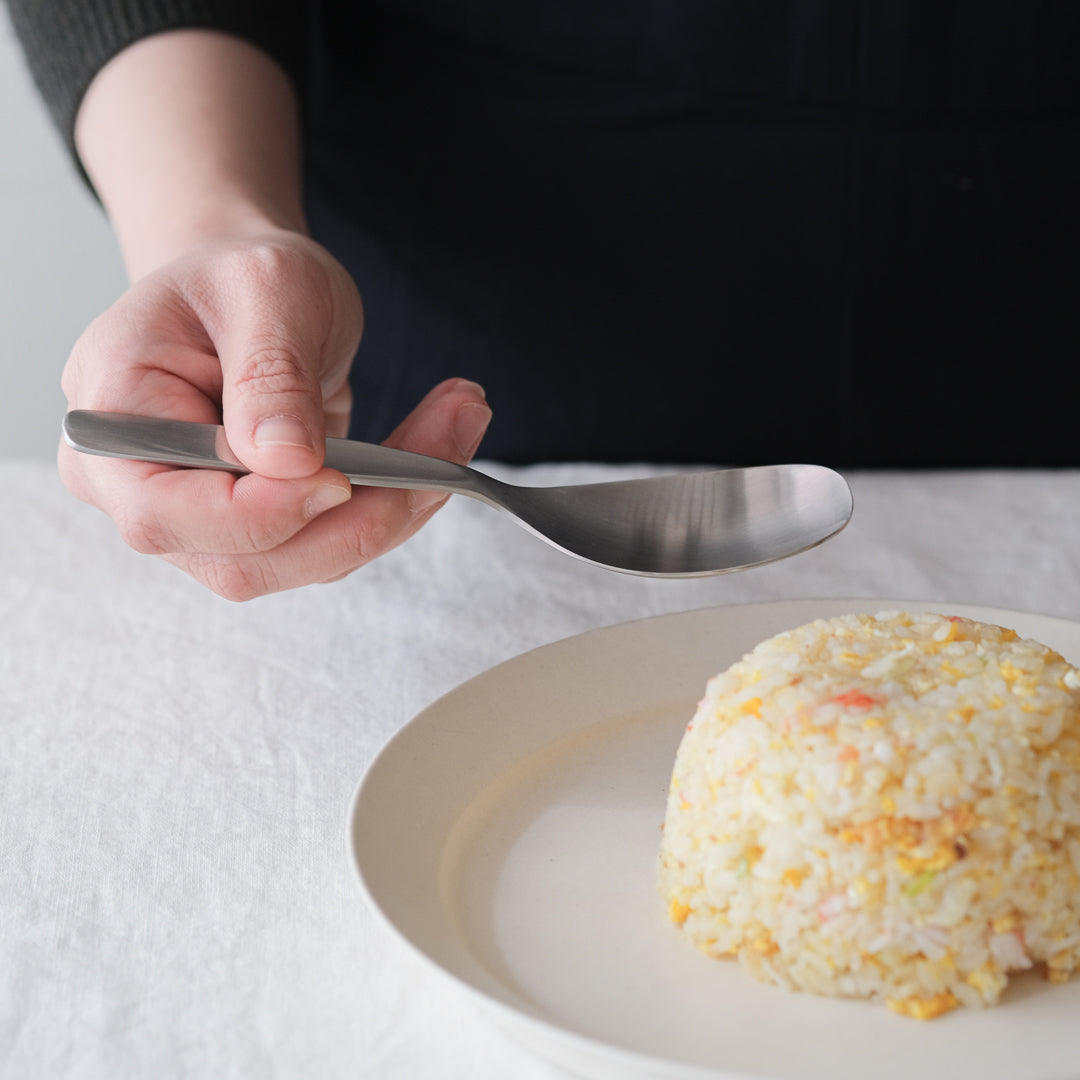この絶妙なサイズ感のスプーンに出合って、チャーハンを崩しながらすくったり、麺類のスープを飲んだり、ときには料理を混ぜ合わせたり…… どんな動作でもで使いやすく、いろんなシーンを兼ねられる寸法があることに驚きました。