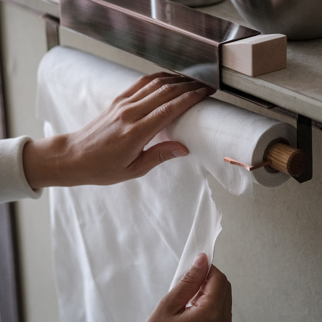 ロール状に巻かれた和晒は手を伸ばしやすく、和晒をぐっと身近な存在にしてくれます。使われている生地はハリがありながらも、やわらかく、吸水性もしっかり。