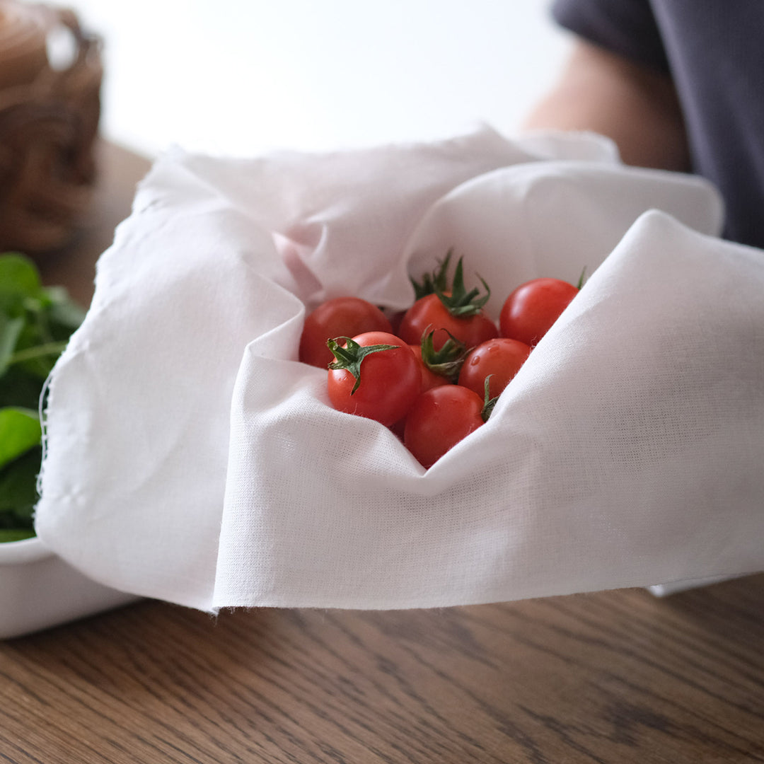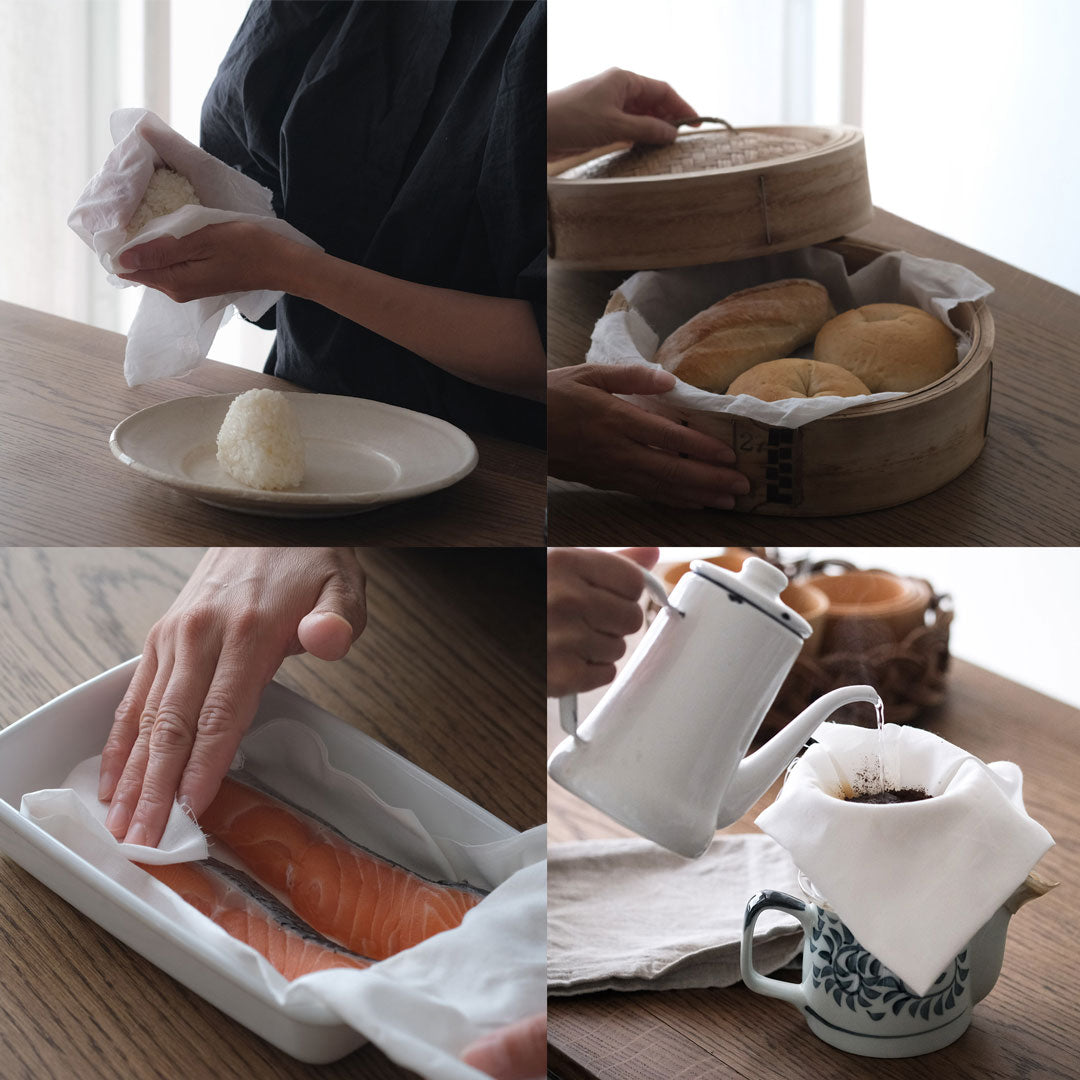 食器や机、手を拭くはもちろん、食材の水分をとる、ぎゅっとしぼる、だしを漉す、蒸す、コーヒーフィルターにもなるし、茶葉をくるんでティーバッグにもなります。