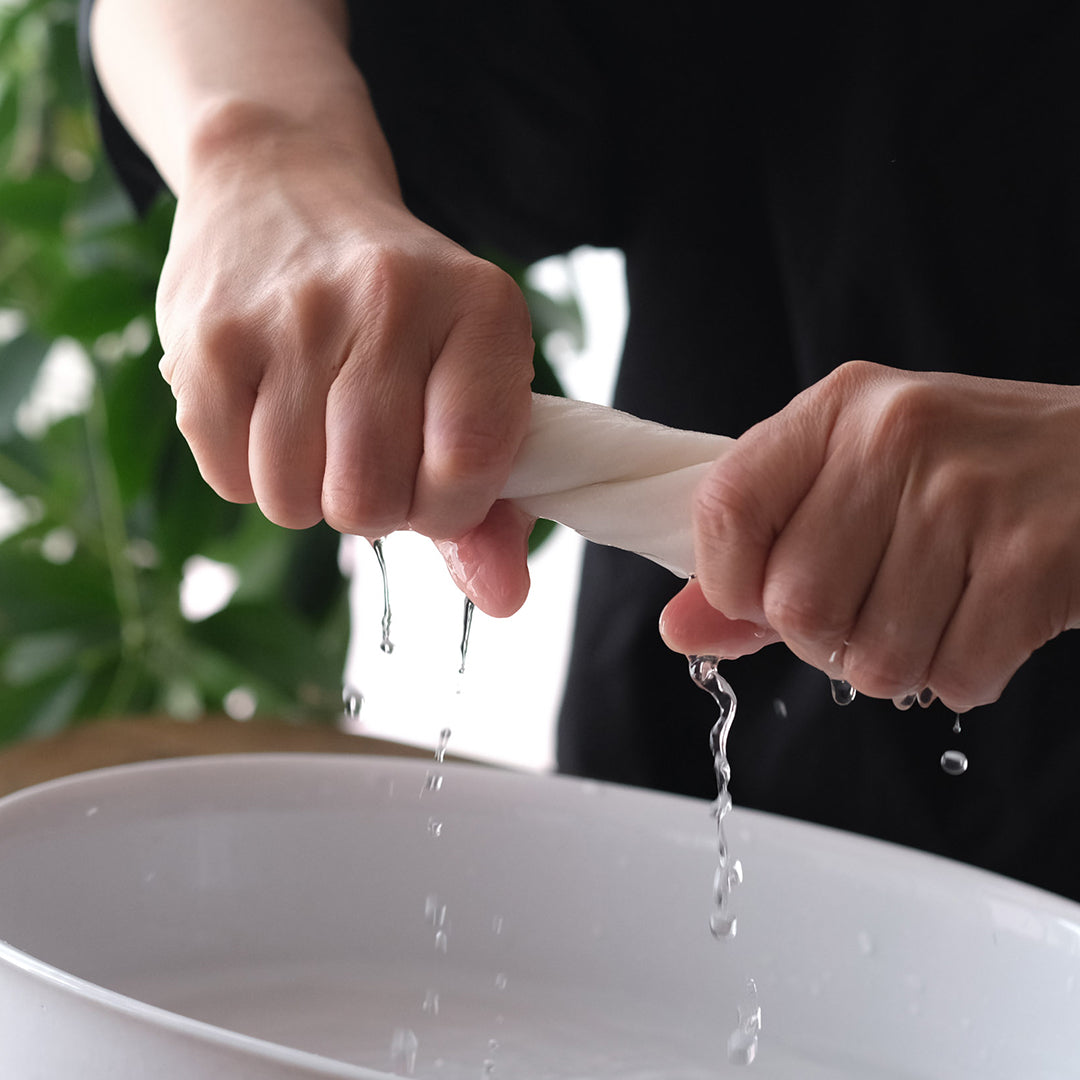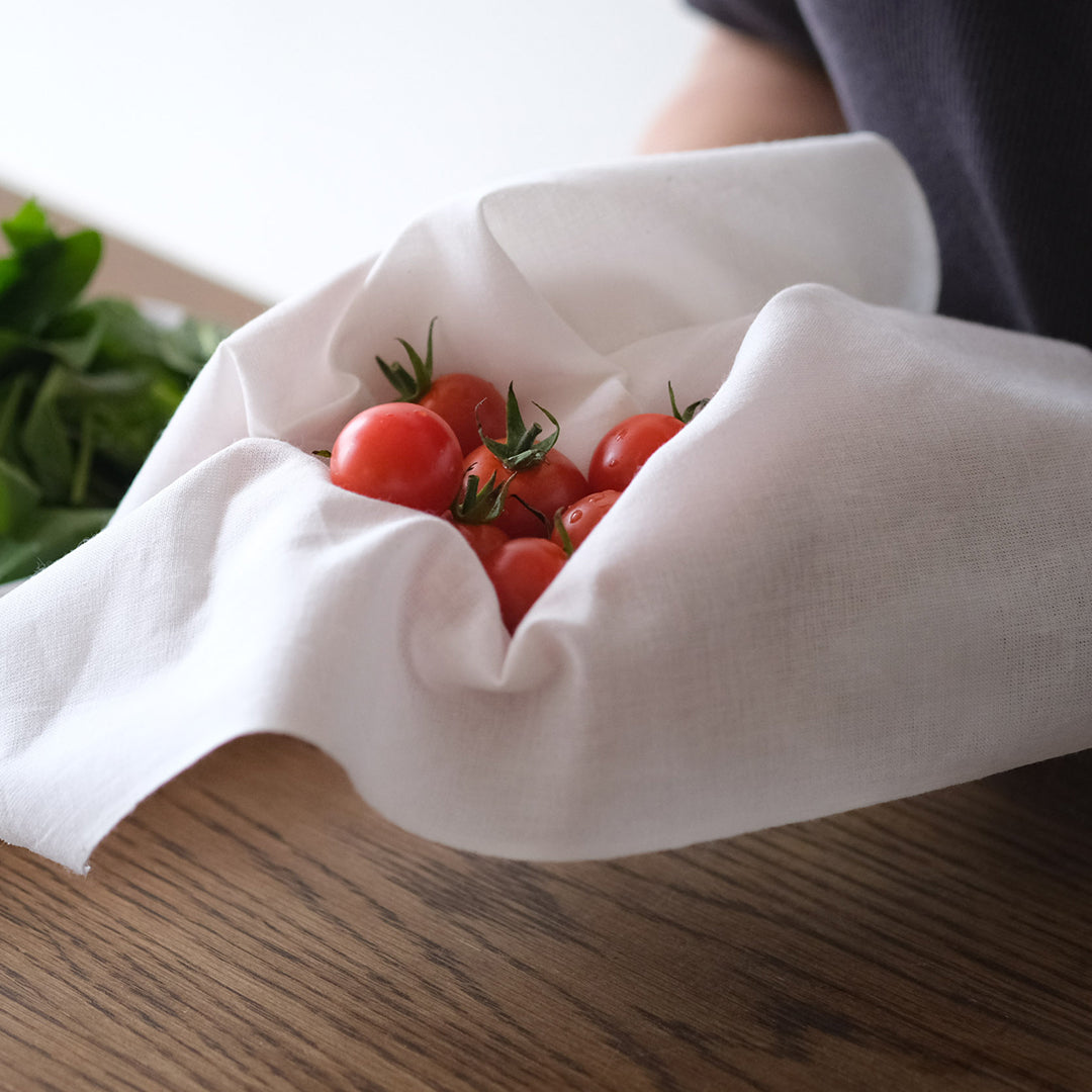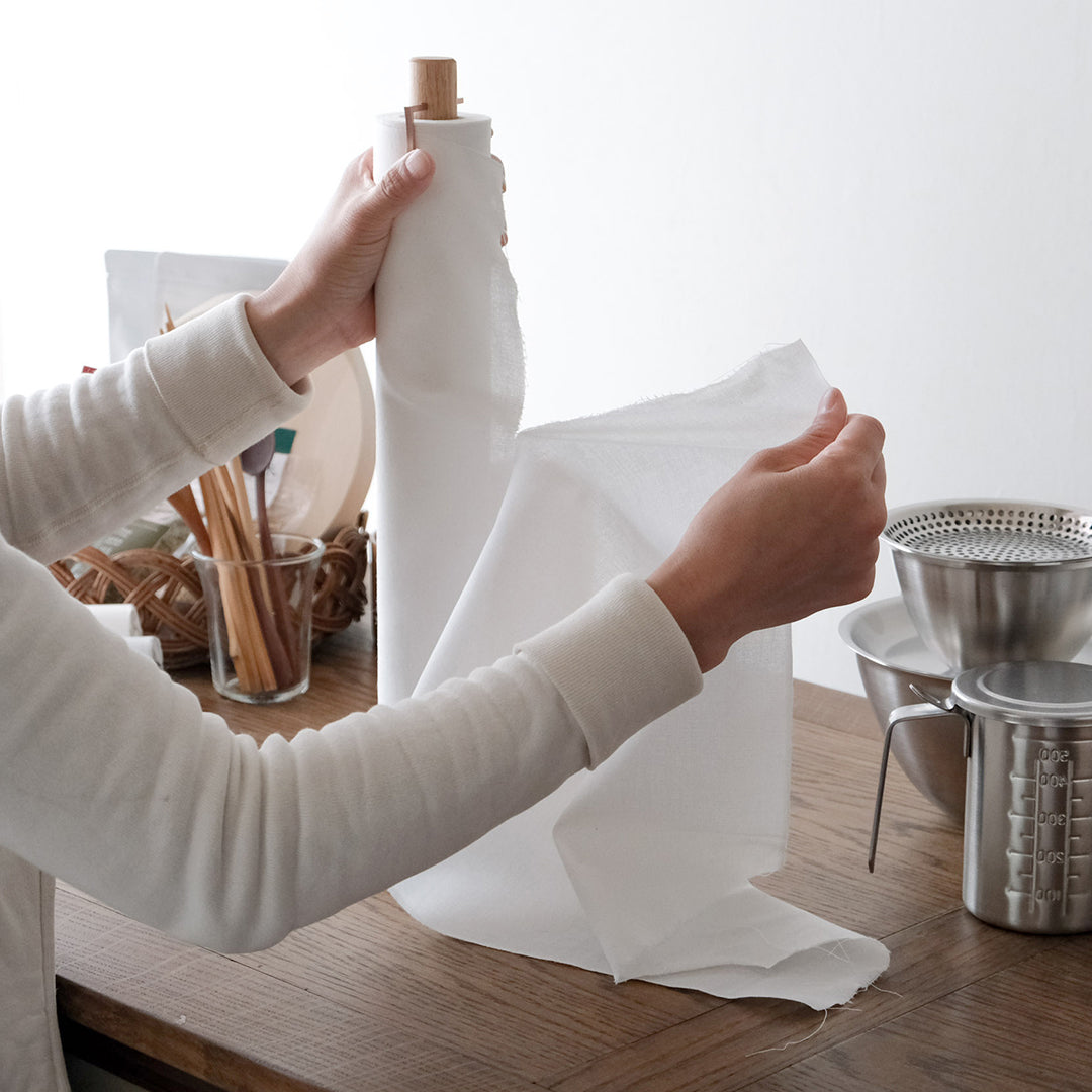 食器や机、手を拭くはもちろん、食材の水分をとる、ぎゅっとしぼる、だしを漉す、蒸す、コーヒーフィルターにもなるし、茶葉をくるんでティーバッグにもなります。