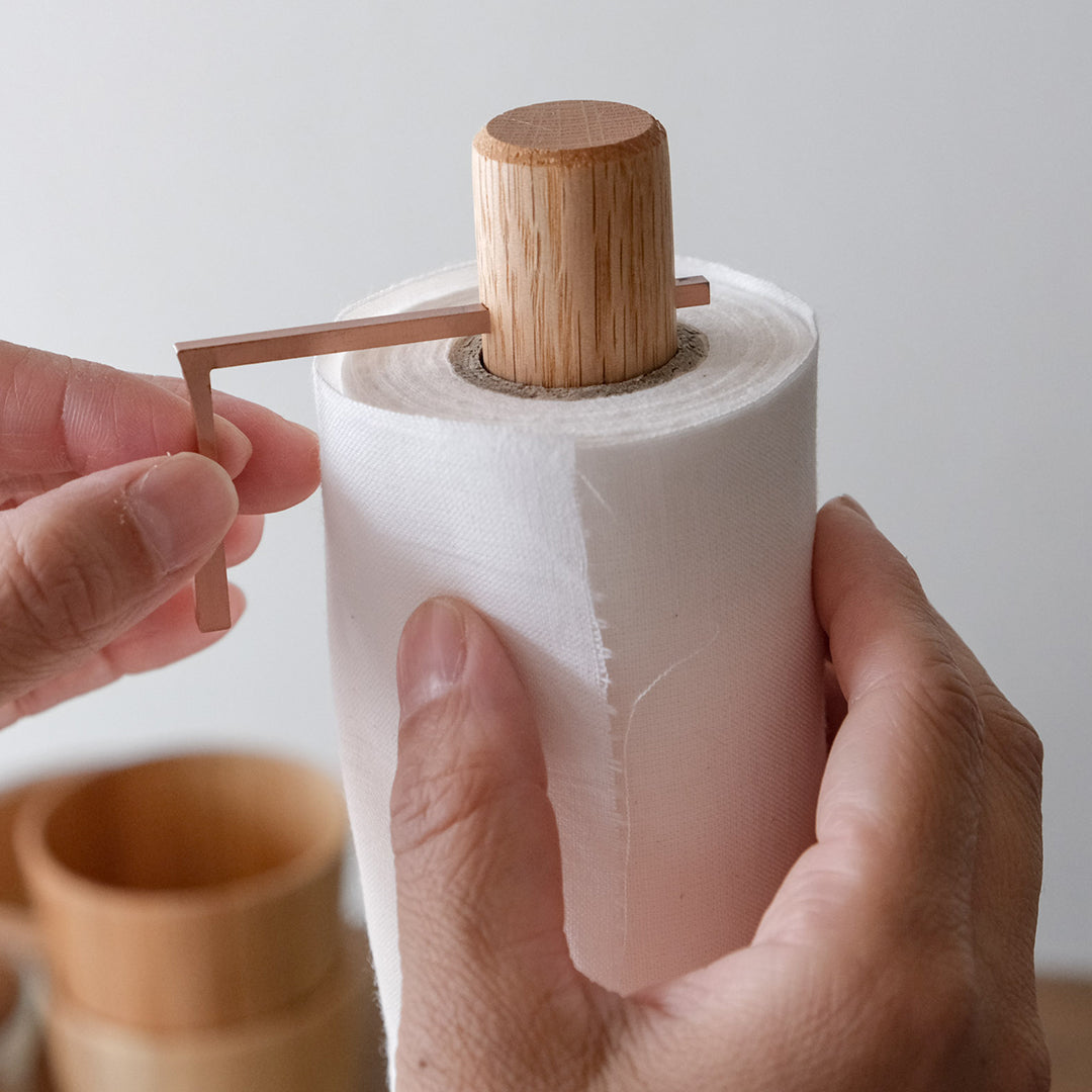 スタンドは和晒を手で切りやすいように、金属の留め具がついています。付属の和晒ロールCutは約35cmごとのミシン目つき。カットした和晒の端には味わいを感じます。