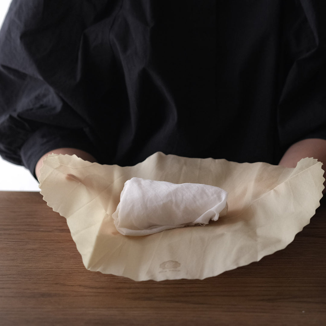 ▲湿らして絞った和晒と[aco wrap]天然ラップで葉野菜を包めば、乾燥から守ってくれます