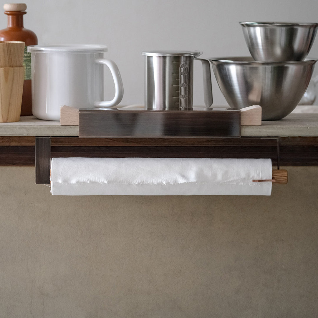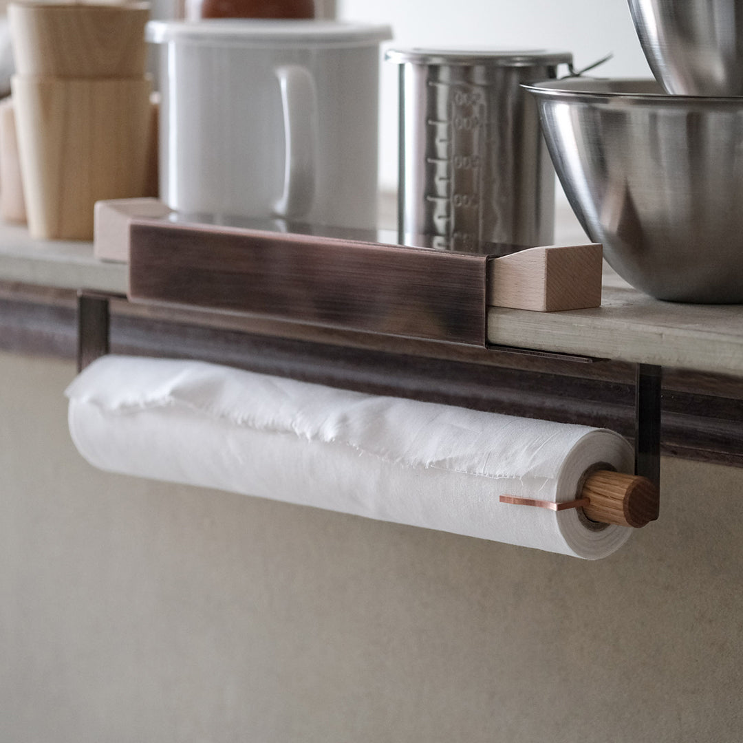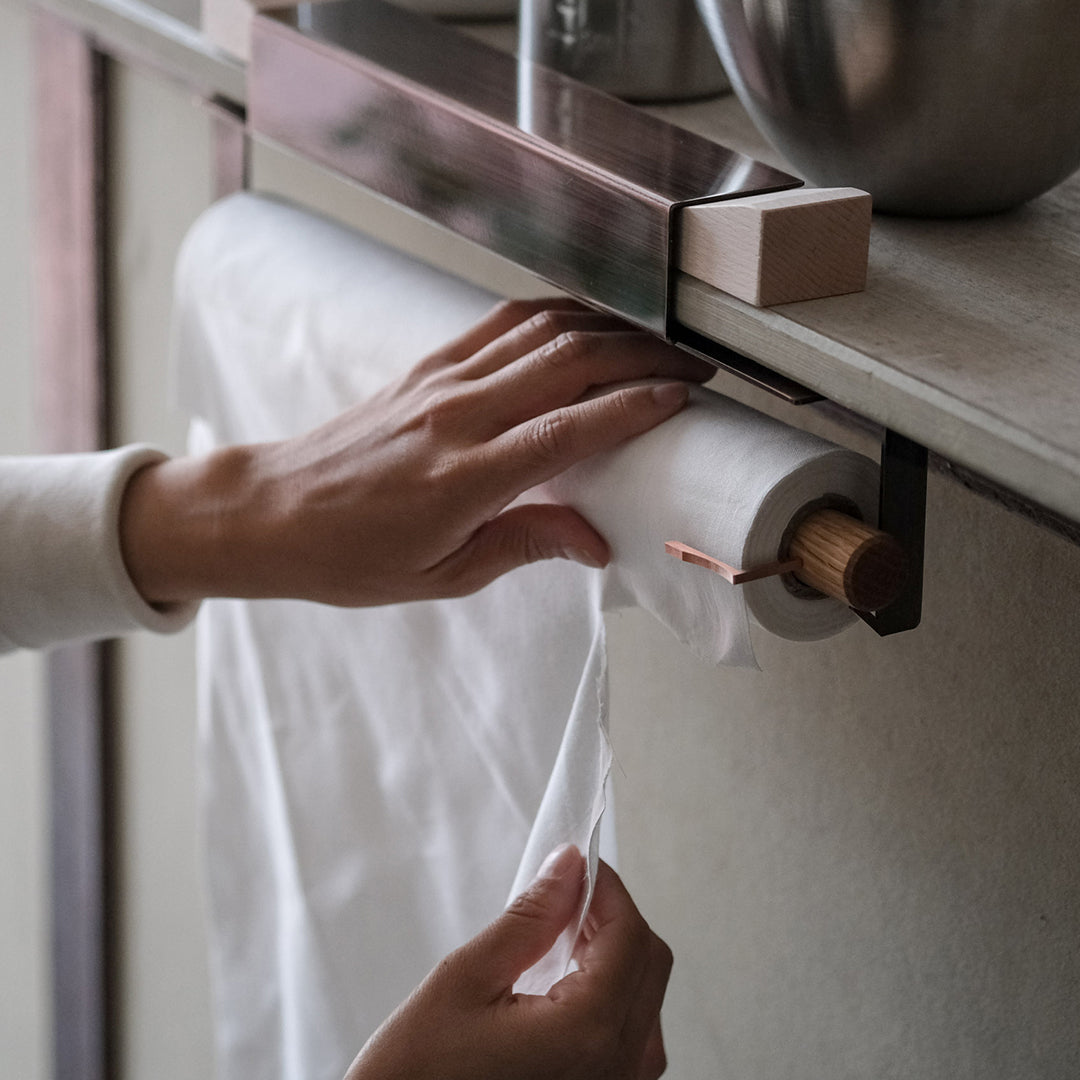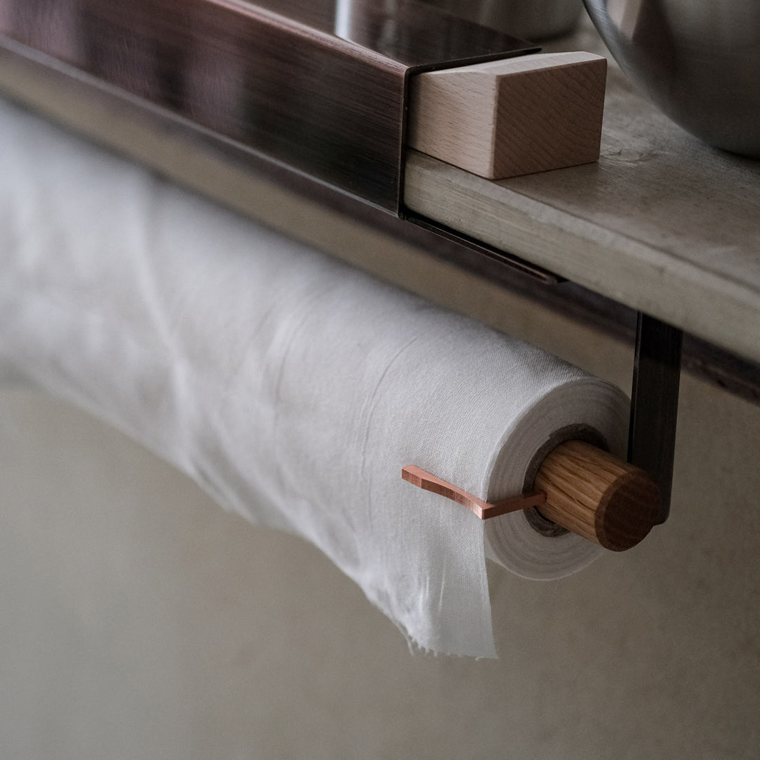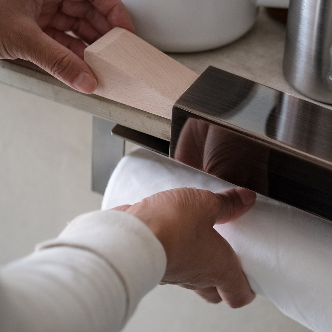 和晒ロールを通す棒の部分はオーク材、そのほかの部分にはブロンズメッキ仕上げのステンレスを使い、どちらも空間になじみのよい素材です。ホルダーの固定に金具は使わず、木製のくさびを採用。15~38mmの棚板の厚さに対応できます。▲両側から、木製のくさびを差し込んで固定
