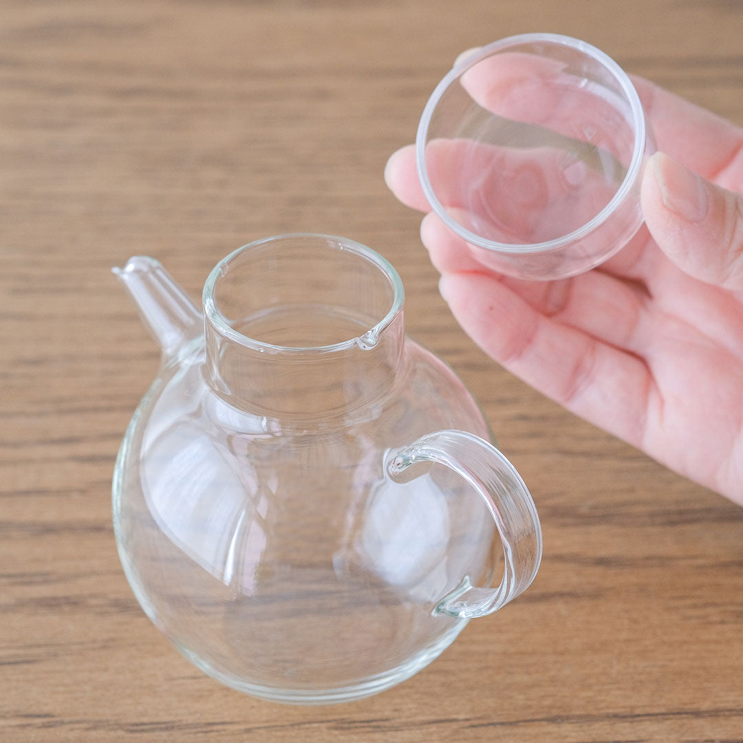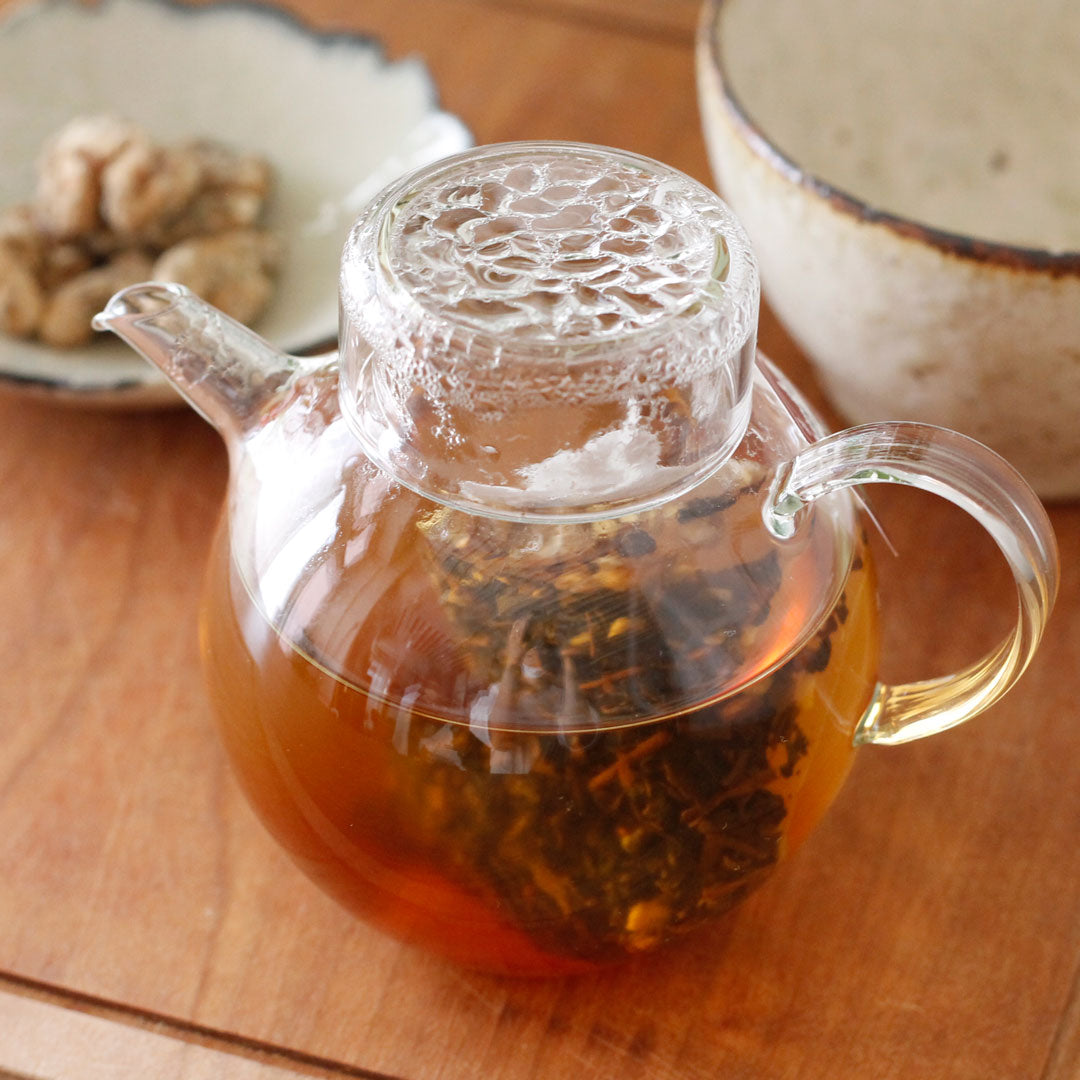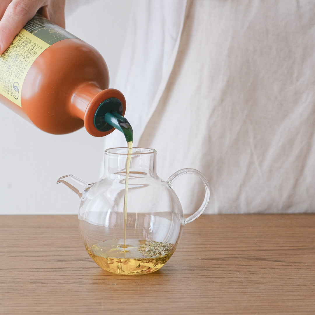ガラス製だから、お茶ならゆらゆらと動く茶葉や変化していく水の色を楽しむことができます。茶葉を直接入れる場合は、茶こしもご用意くださいね。