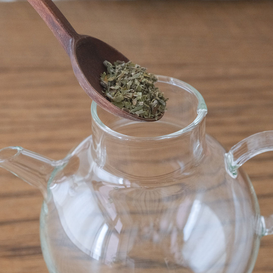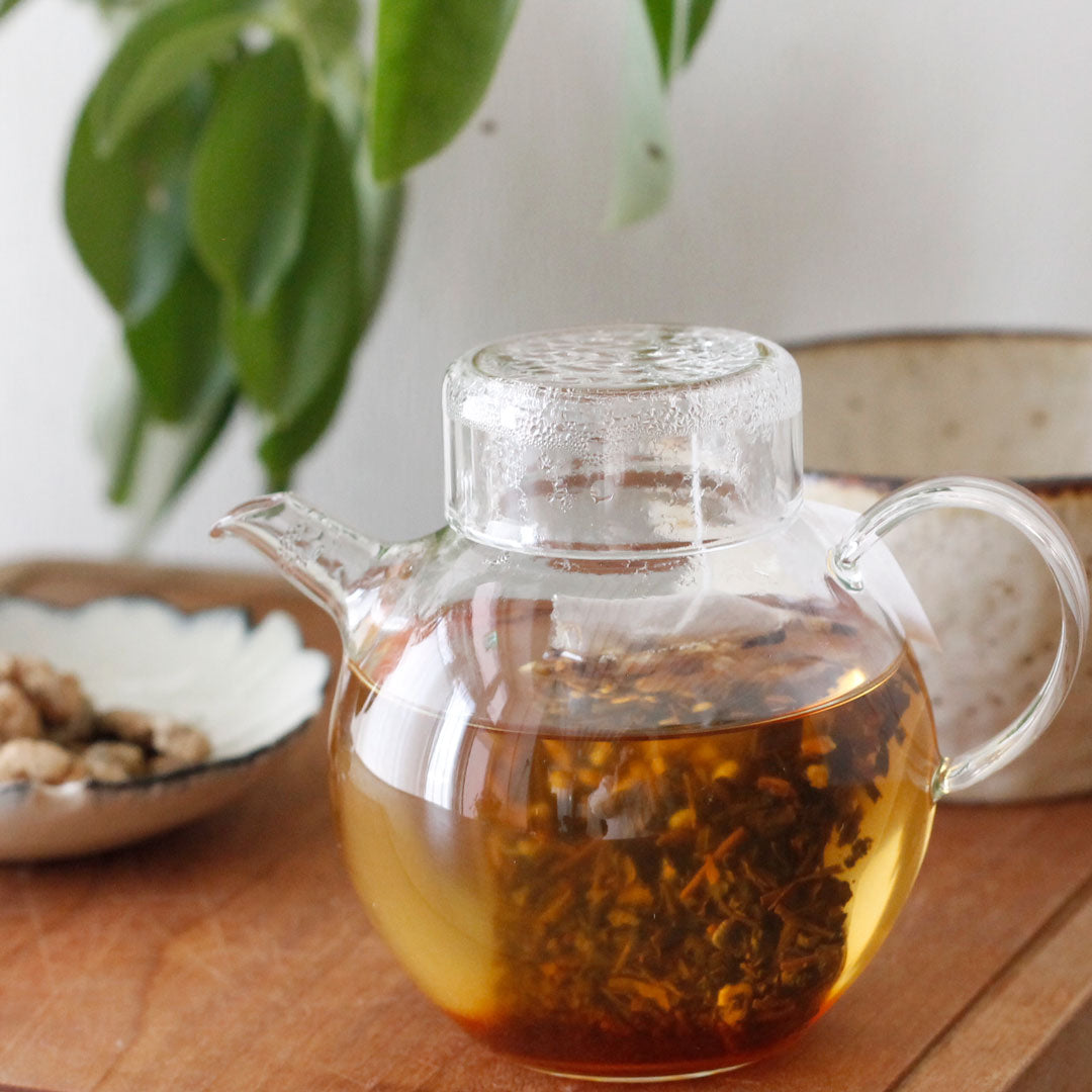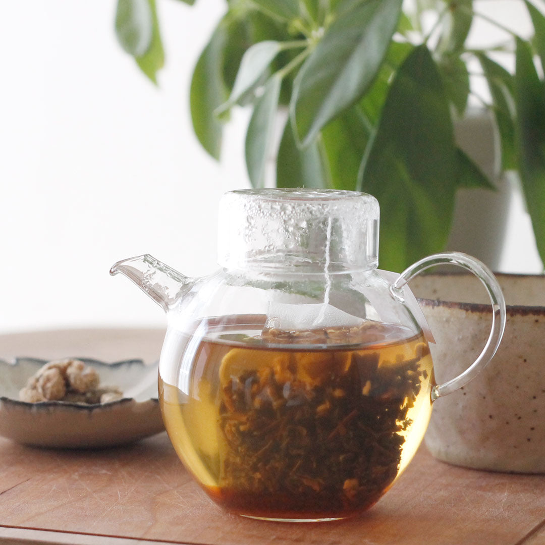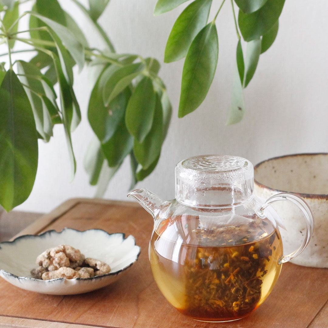 ガラス製だから、お茶ならゆらゆらと動く茶葉や変化していく水の色を楽しむことができます。茶葉を直接入れる場合は、茶こしもご用意くださいね。