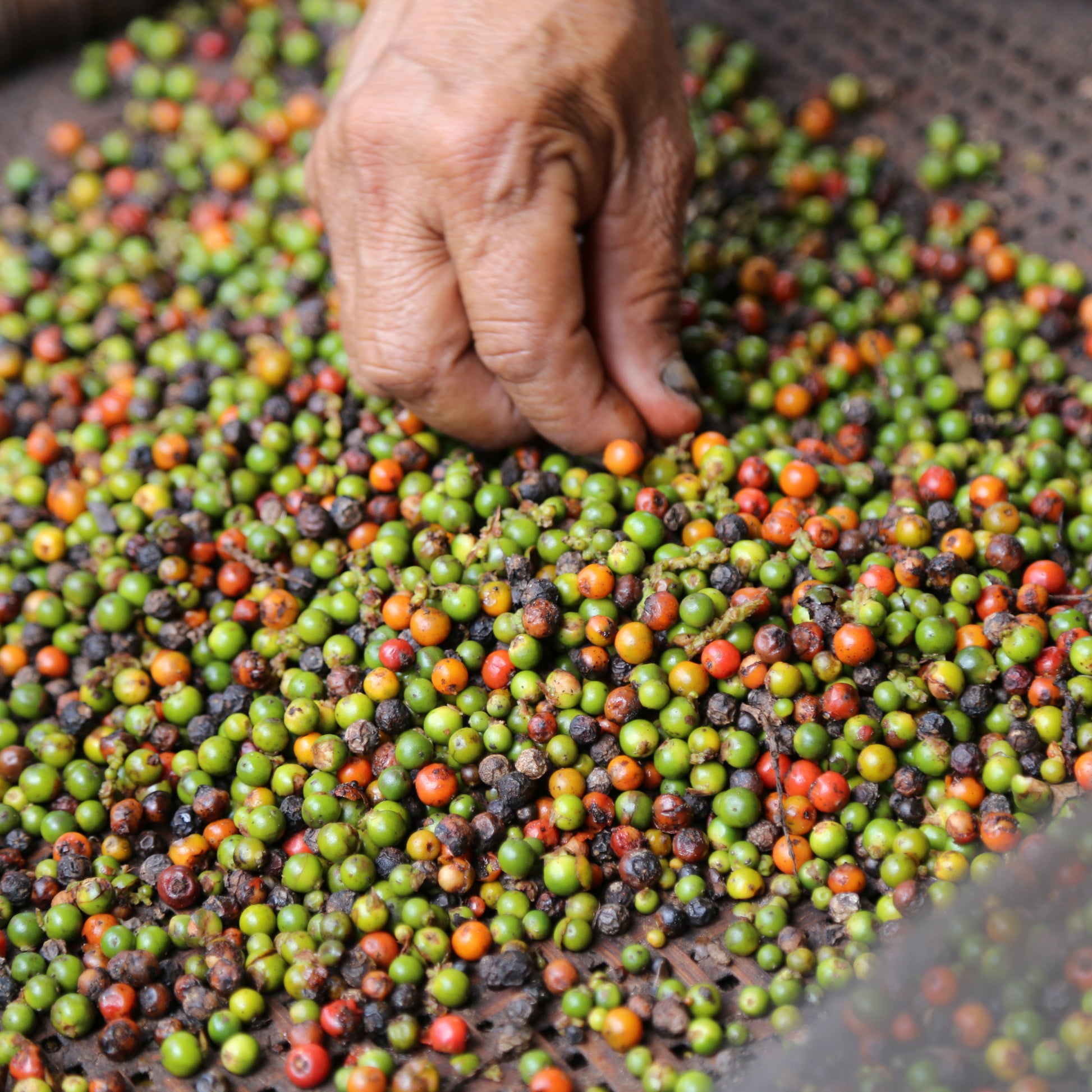 通常11月~3月頃までが胡椒の収穫期。生胡椒の塩漬けは初期の若く柔らかな実だけを選び、収穫後すぐ塩漬け加工されます。