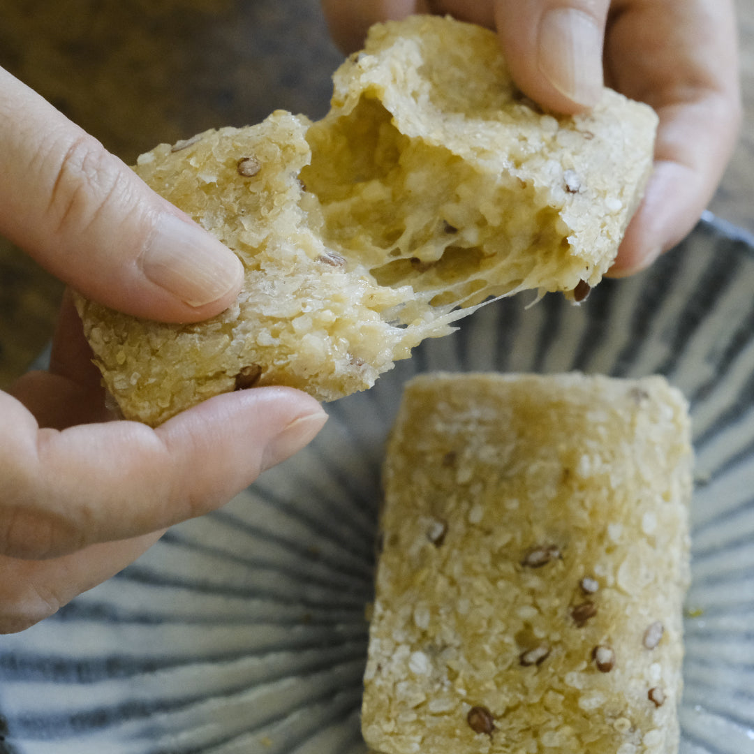 ふっくらと焼いたお餅を割ると、湯気とともに玄米のつぶつぶが登場。ふうふうしながら食べると、口の中で弾けるつぶつぶ……。