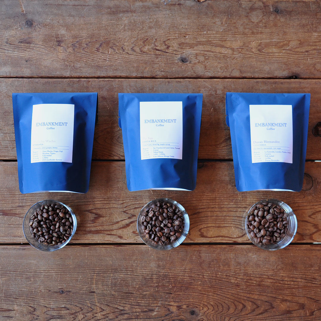 ブレンド2袋に、シングルオリジンのライトロースト(浅煎り)専門ブランドEMBANKMENT Coffeeのシングルオリジン1袋を組み合わせることもできます。