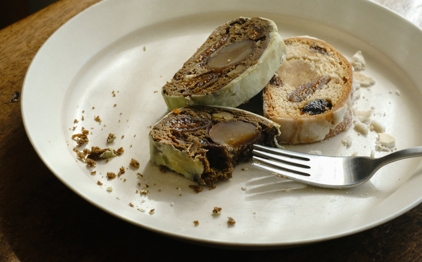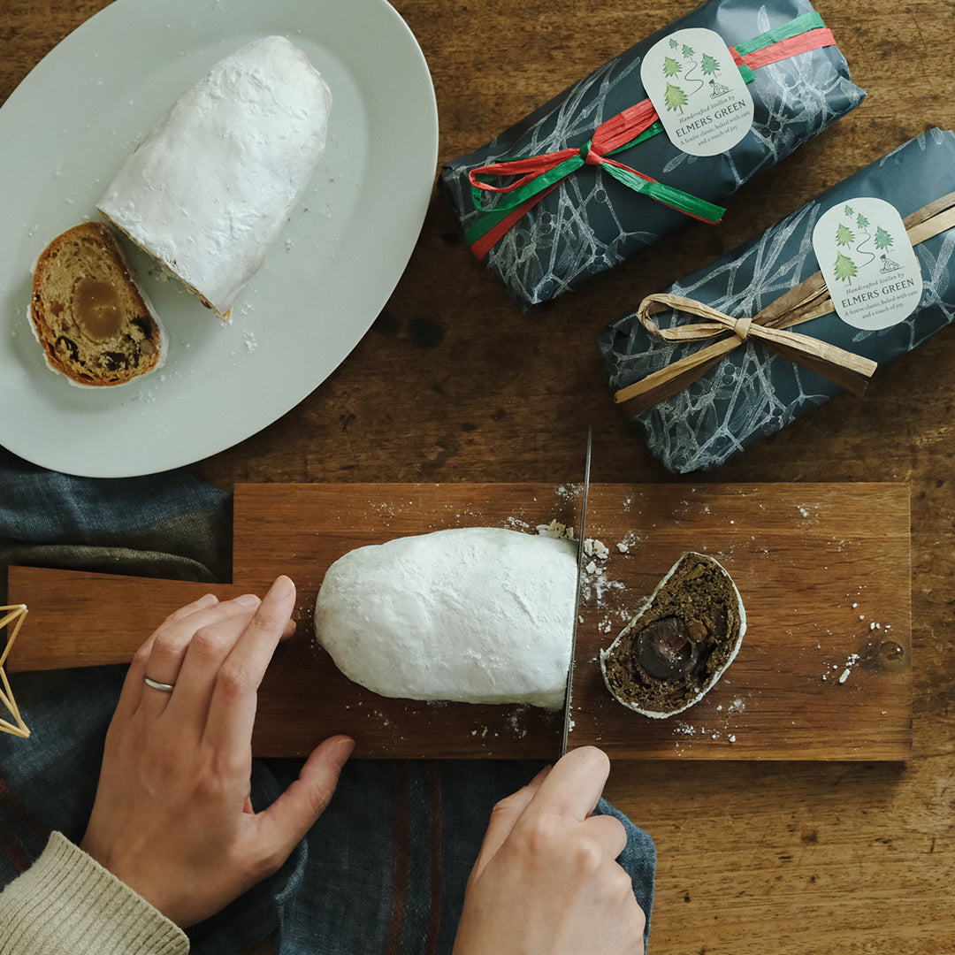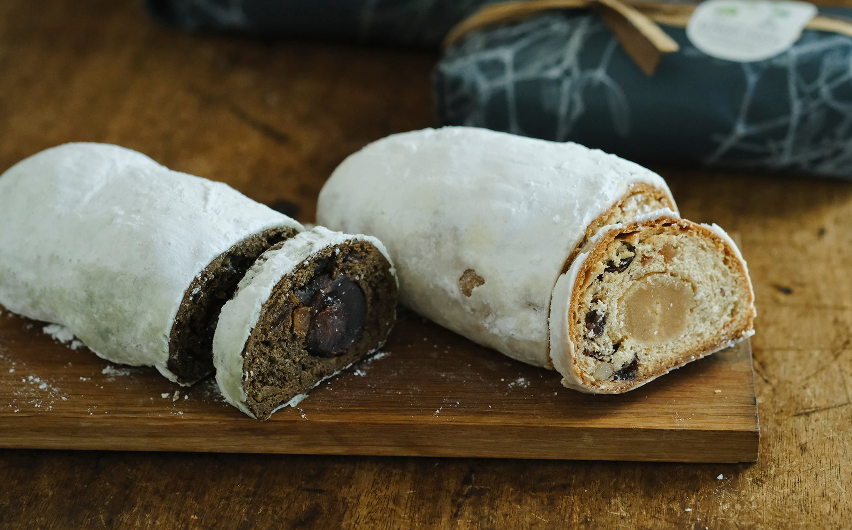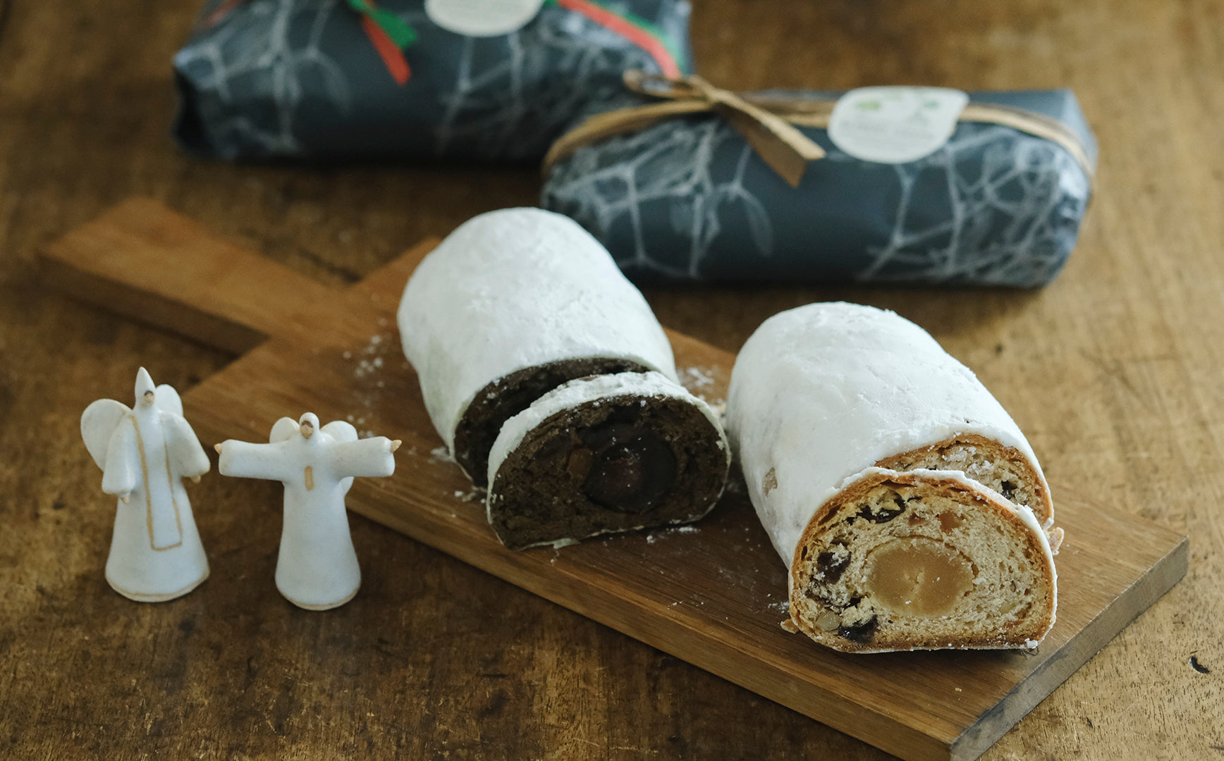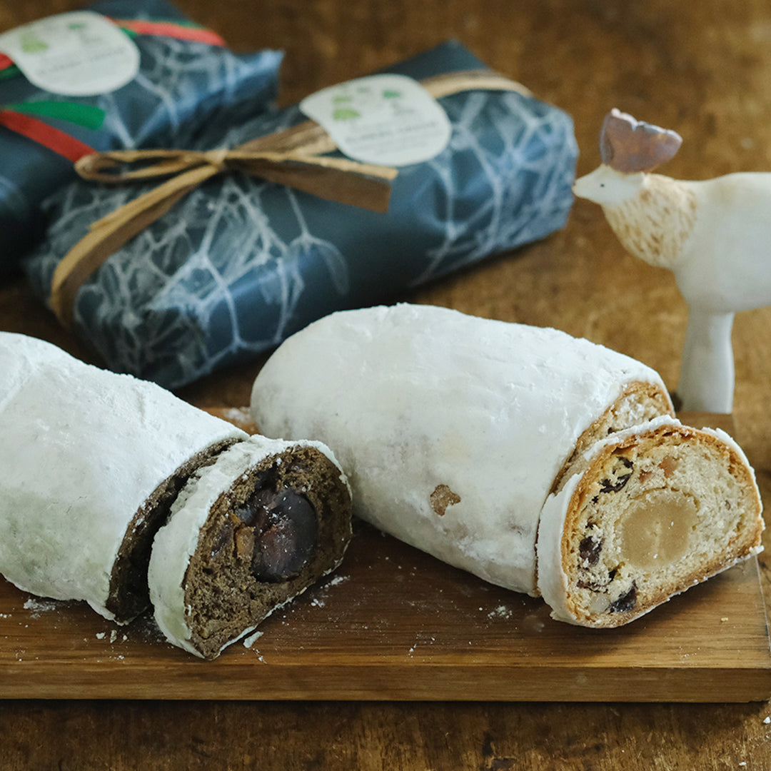 毎年ご好評いただいているELMERS GREENのシュトレン。今年は、たっぷりローマジパンを包んだクラシックタイプのシュトレン「プレーン」と、ほろ苦く香ばしい香りに渋皮栗と白いちじくを合わせた「ほうじ茶と渋皮栗」。だんだんと馴染んでいく味わいをゆっくりお楽しみください。