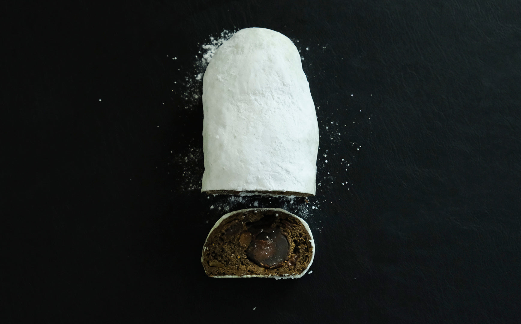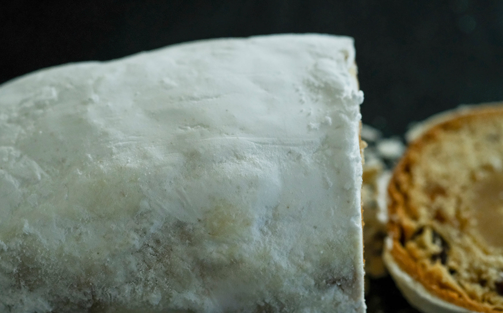 低温でしっかり焼いたあと、バターで何層にもコーティング。最後に粉糖で仕上げることで長い期間楽しめるシュトレン。