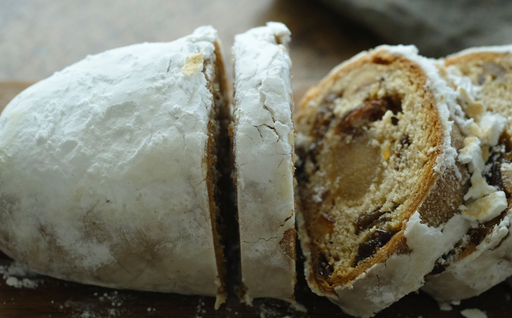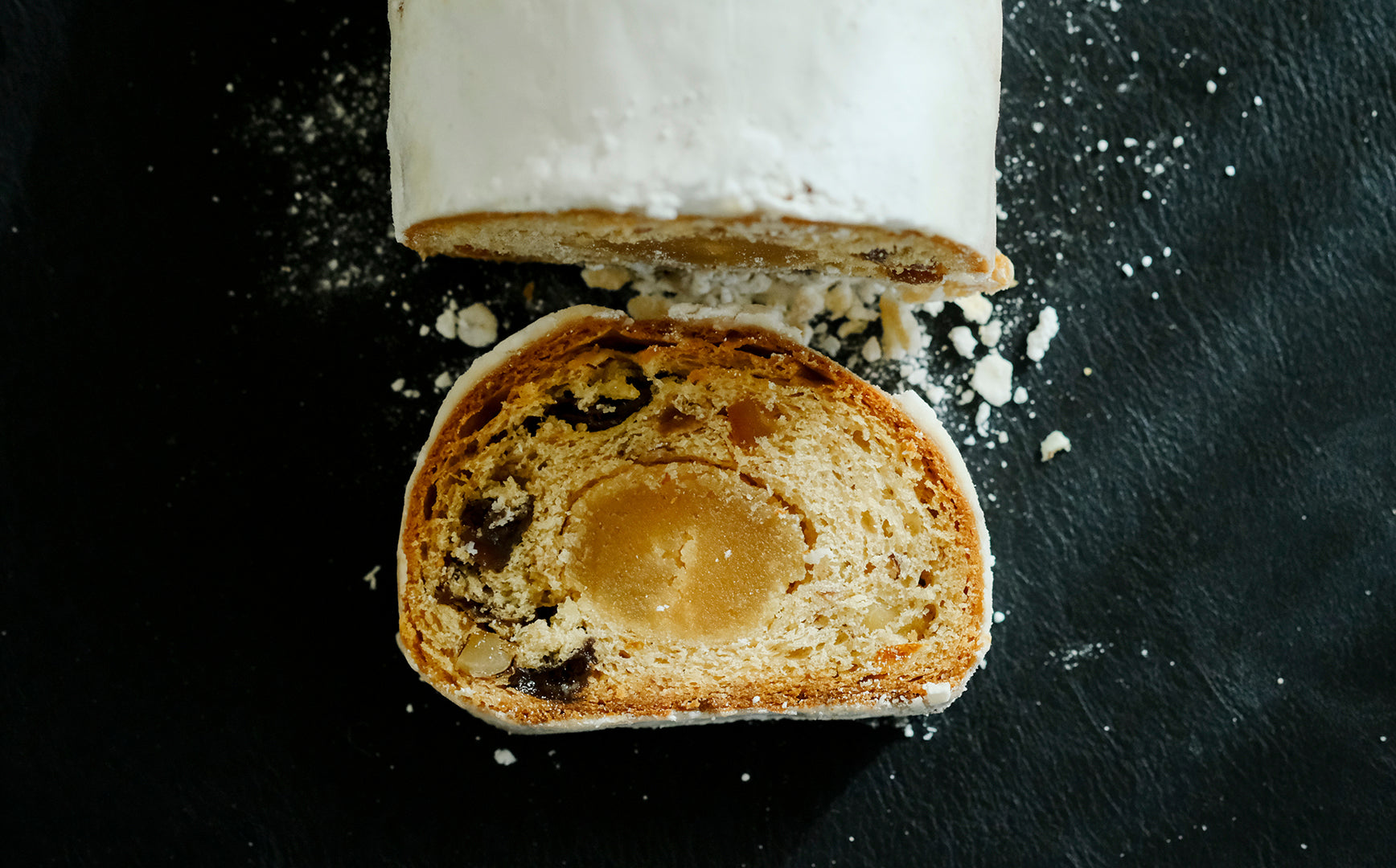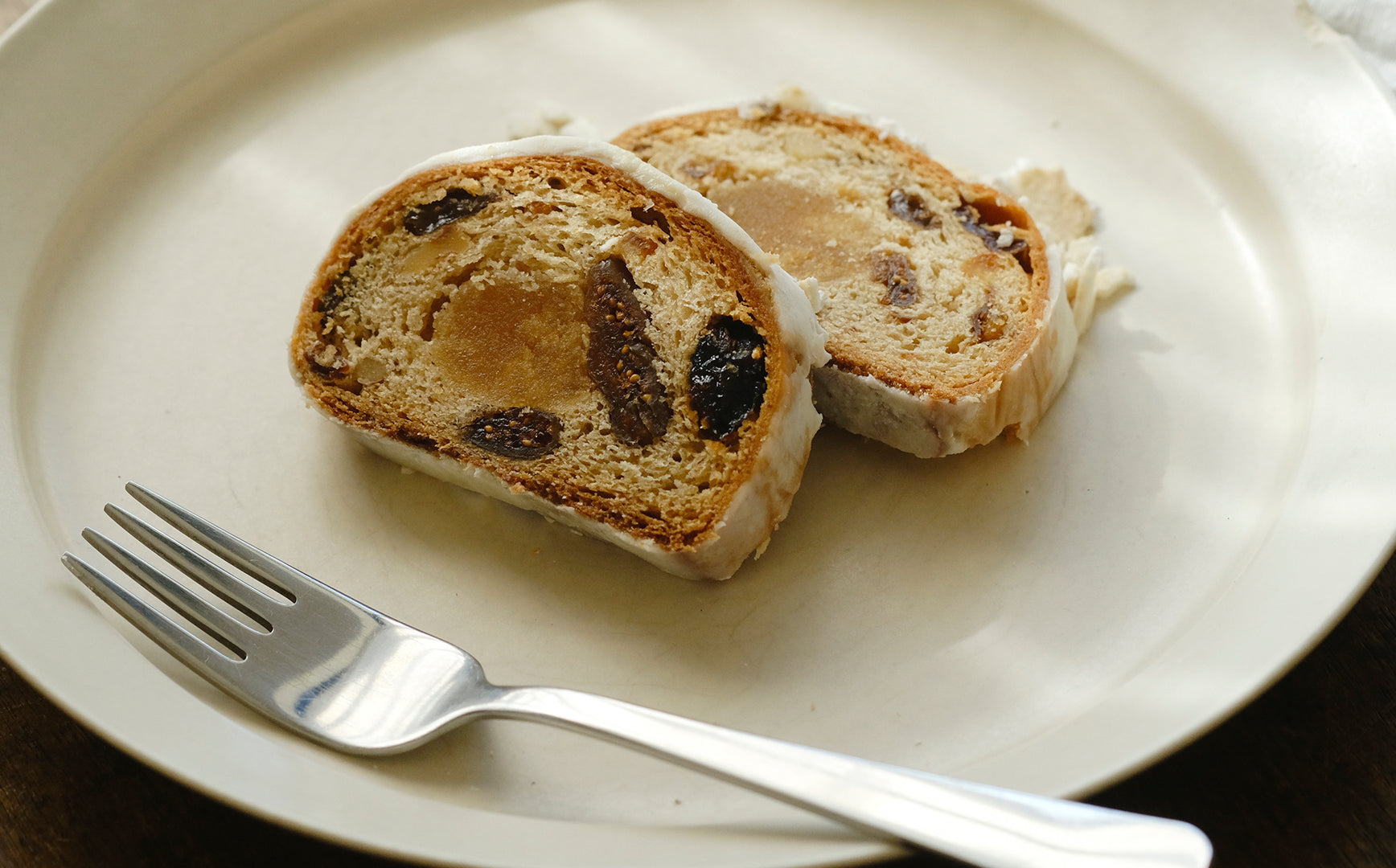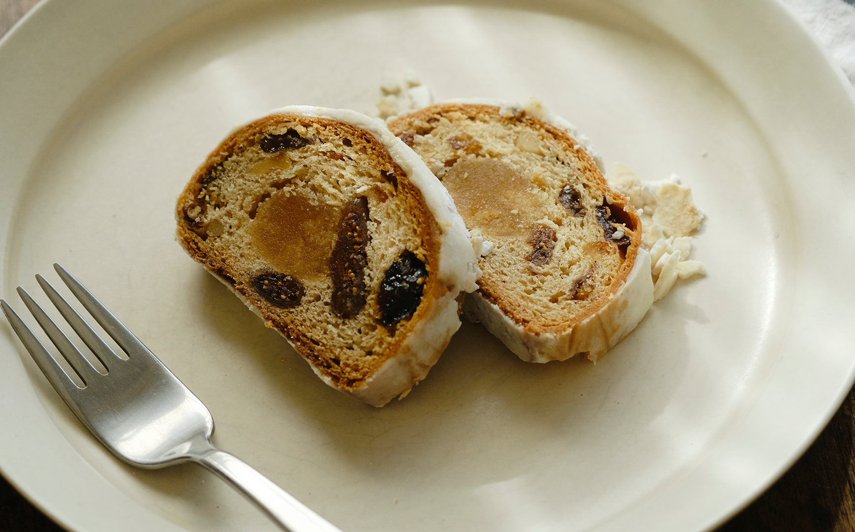 シュトレンはドイツ発祥のクリスマスのお菓子。お酒に漬け込んだドライフルーツとマジパンを混ぜ込んでじっくり焼いた発酵菓子です。